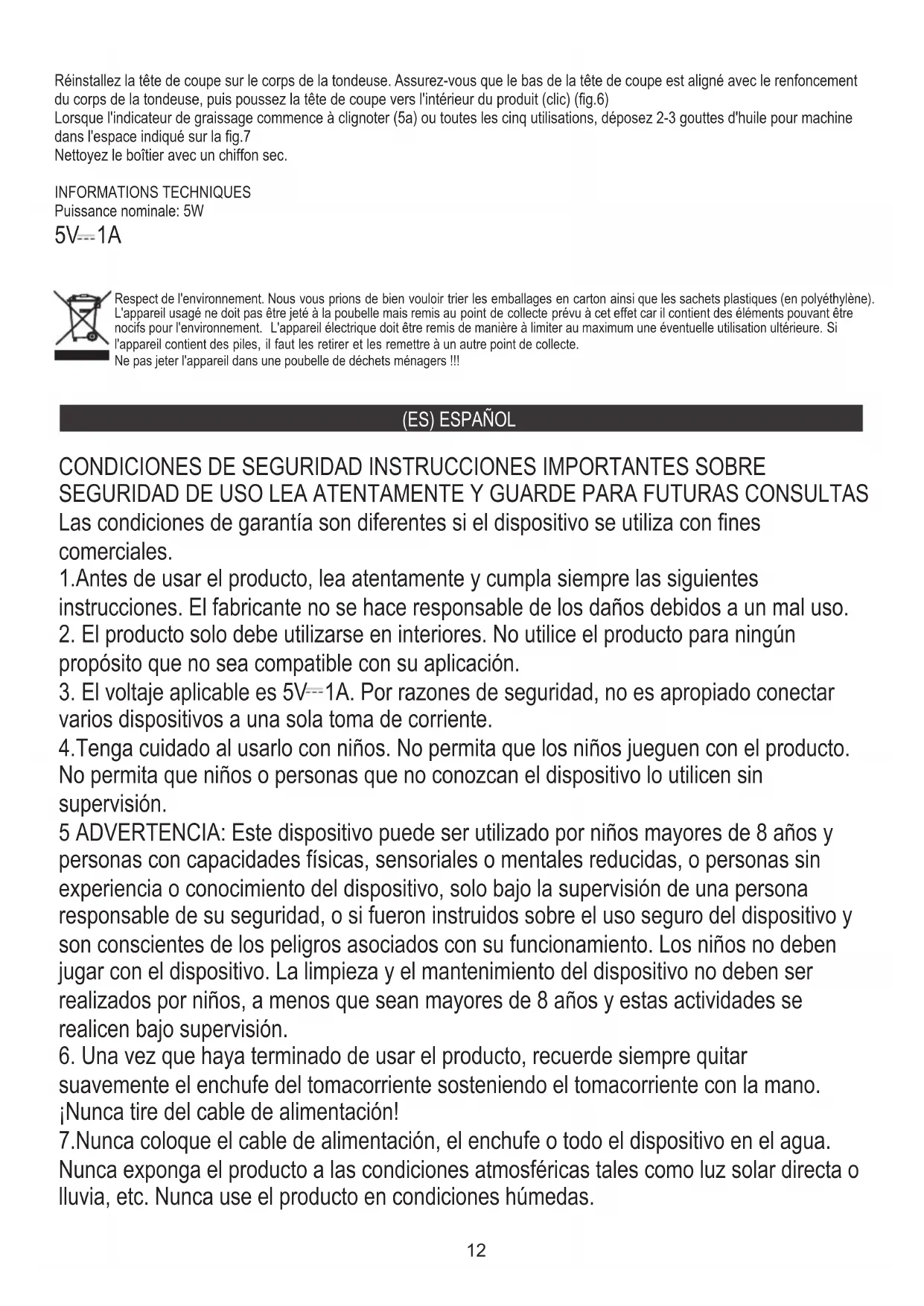 14.Para brindar protección adicional, se recomienda instalar un dispositivo de corriente residual (RCD) en el circuito de alimentación, con una clasificación de corriente residual no superior a 30 mA. Comuníquese con un electricista profesional en este asunto.14 Cuando el producto funciona todo el tiempo por 60 minutos, el indicador de lubricación (5a) comenzará a parpadear para recordarle que limpie y engrase la cuchilla (consulte el punto con el método de limpieza). INDICACIÓN DE ACEITE (5a) Mantenga pulsado el botón de encendido (4) durante 3 segundos para activar o desactivar el bloqueo de seguridad. Cada vez que presione el botón "+" o "-" (3), ajustará 500 RPM (5b) BOTÓN DE ENCENDIDO / BLOQUEO DE SEGURIDAD (4) Presione el botón de encendido (4) para encenderlo o apagarlo Rango de velocidad del motor: 5 niveles de velocidad están disponibles 5000-7000 RPM BOTÓN DE CONTROL DE VELOCIDAD (3) Indicador de velocidad (5b) Seleccione la longitud de corte deseada girando el botón de ajuste de la longitud de corte (2): 0,8 / 1,1 / 1,4 / 1,7 / 2,0mm Nota: Cuando se agota la batería, puede usarlo mientras se carga. Cuando la batería alcanza el 10%, 5% 0%, sonará 3 veces. Cuando la batería se reduce al 10%, el indicador de carga (5d) comenzará a parpadear El tiempo de carga es de aproximadamente 2 horas. Después de que el producto esté completamente cargado, el tiempo de funcionamiento es de aproximadamente 210 minutos. Una vez que la batería esté completamente cargada, se escuchará un "bip" y el recordatorio de capacidad de la batería (5c) mostrará 100% y la luz de carga (5d) parpadeará al mismo tiempo. Cuando enchufe el adaptador de corriente en el enchufe, se escuchará un "bip" y el indicador de carga (5d) comenzará a parpadear de abajo hacia arriba. 5V 1A Potencia nominal: 5W