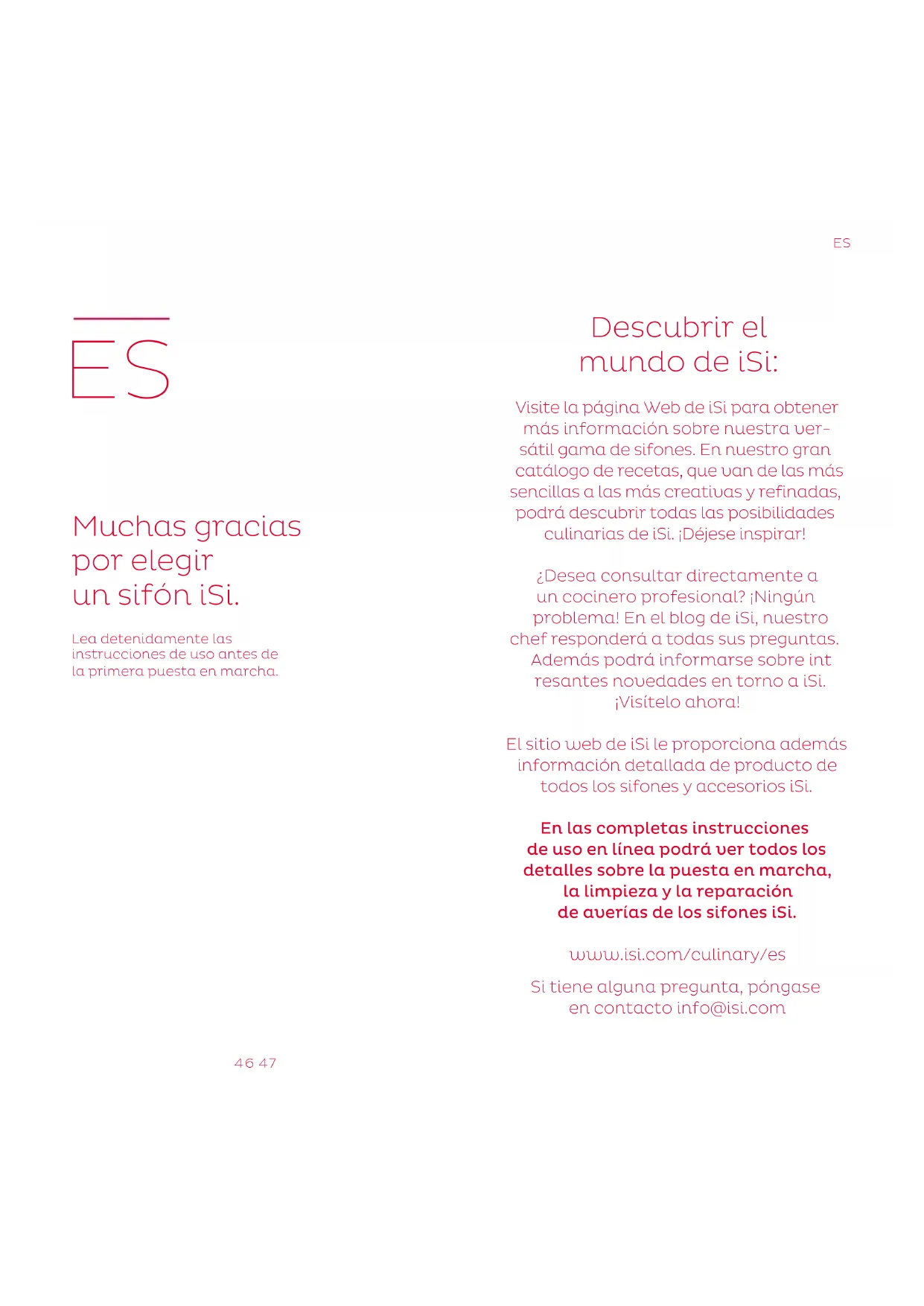 stato danneggiato ——— „Procedere come descritto in "Scaricare la pressione" e spedire il sifone a iSi o al centro di assistenza. Assistenza. Le parti di ricambio sono disponibili singolar- mente e a prezzi convenienti. Per ordinare le parti di ricambio, rivolgersi al proprio rivenditore specializzato. In Austria è possibile anche inviare un'e-mail all'indirizzo info@isi.com. Per la riparazione, spedire sempre l'intero sifone. IT46 47 Descubrir el mundo de iSi: Visite la página Web de iSi para obtener más información sobre nuestra ver- sátil gama de sifones. En nuestro gran catálogo de recetas, que van de las más sencillas a las más creativas y refinadas, podrá descubrir todas las posibilidades culinarias de iSi. ¡Déjese inspirar! ¿Desea consultar directamente a un cocinero profesional? ¡Ningún problema! En el blog de iSi, nuestro chef responderá a todas sus preguntas. Además podrá informarse sobre int resantes novedades en torno a iSi. ¡Visítelo ahora! El sitio web de iSi le proporciona además información detallada de producto de todos los sifones y accesorios iSi. En las completas instrucciones de uso en línea podrá ver todos los detalles sobre la puesta en marcha, la limpieza y la reparación de averías de los sifones iSi. www.isi.com/culinary/es Si tiene alguna pregunta, póngase en contacto info@isi.com