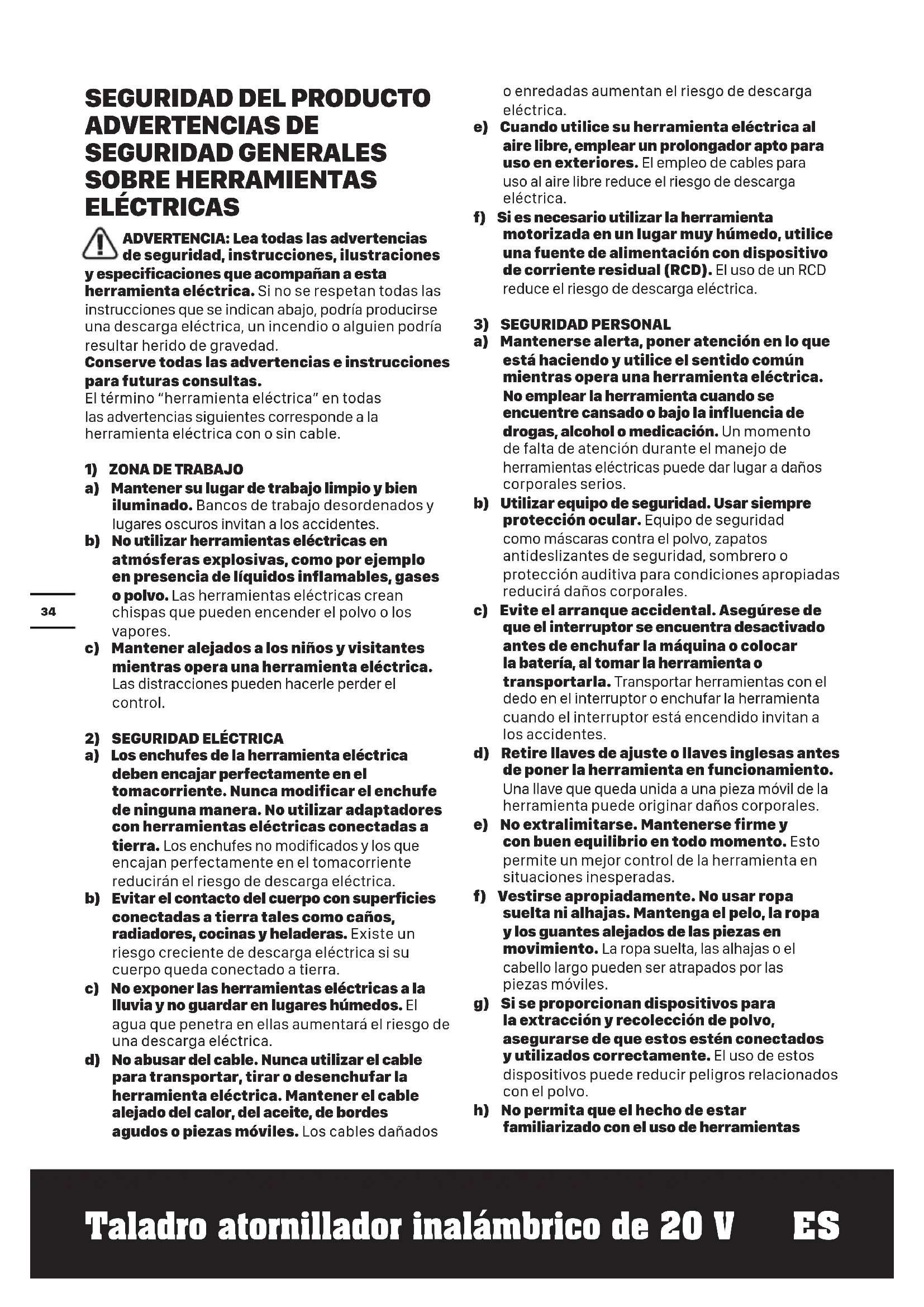 a) Permitir que el mantenimiento de su herramienta eléctrica sea efectuado por una persona calificada usando solamente piezas de recambio idénticas. Esto es primordial para mantener la seguridad de la herramienta eléctrica. b) No intente reparar nunca una batería dañada. Cualquier intervención técnica en una batería debe ser realizada exclusivamente por el fabricante o por un servicio técnico autorizado.36 Taladro atornillador inalámbrico de 20 V