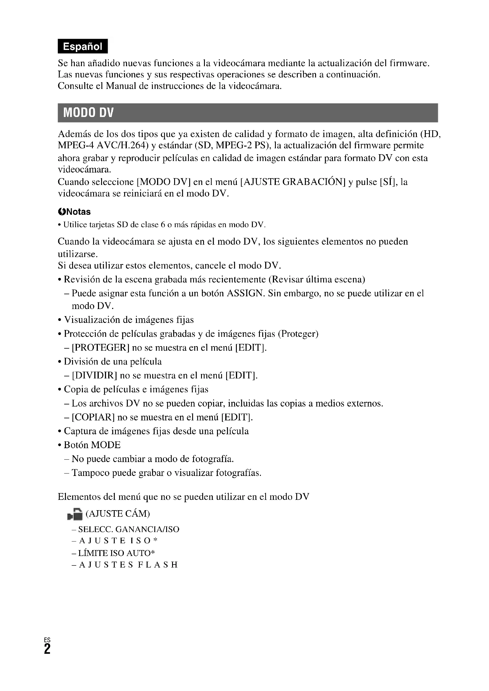 Se han añadido nuevas funciones a la videocámara mediante la actualización del firmware. Las nuevas funciones y sus respectivas operaciones se describen a continuación. Consulte el Manual de instrucciones de la videocámara. Además de los dos tipos que ya existen de calidad y formato de imagen, alta definición (HD, MPEG-4 AVC/H.264) y estándar (SD, MPEG-2 PS), la actualización del firmware permite ahora grabar y reproducir películas en calidad de imagen estándar para formato DV con esta videocámara. Cuando seleccione [MODO DV] en el menú [AJUSTE GRABACIÓN] y pulse [SÍ], la videocámara se reiniciará en el modo DV. b Notas