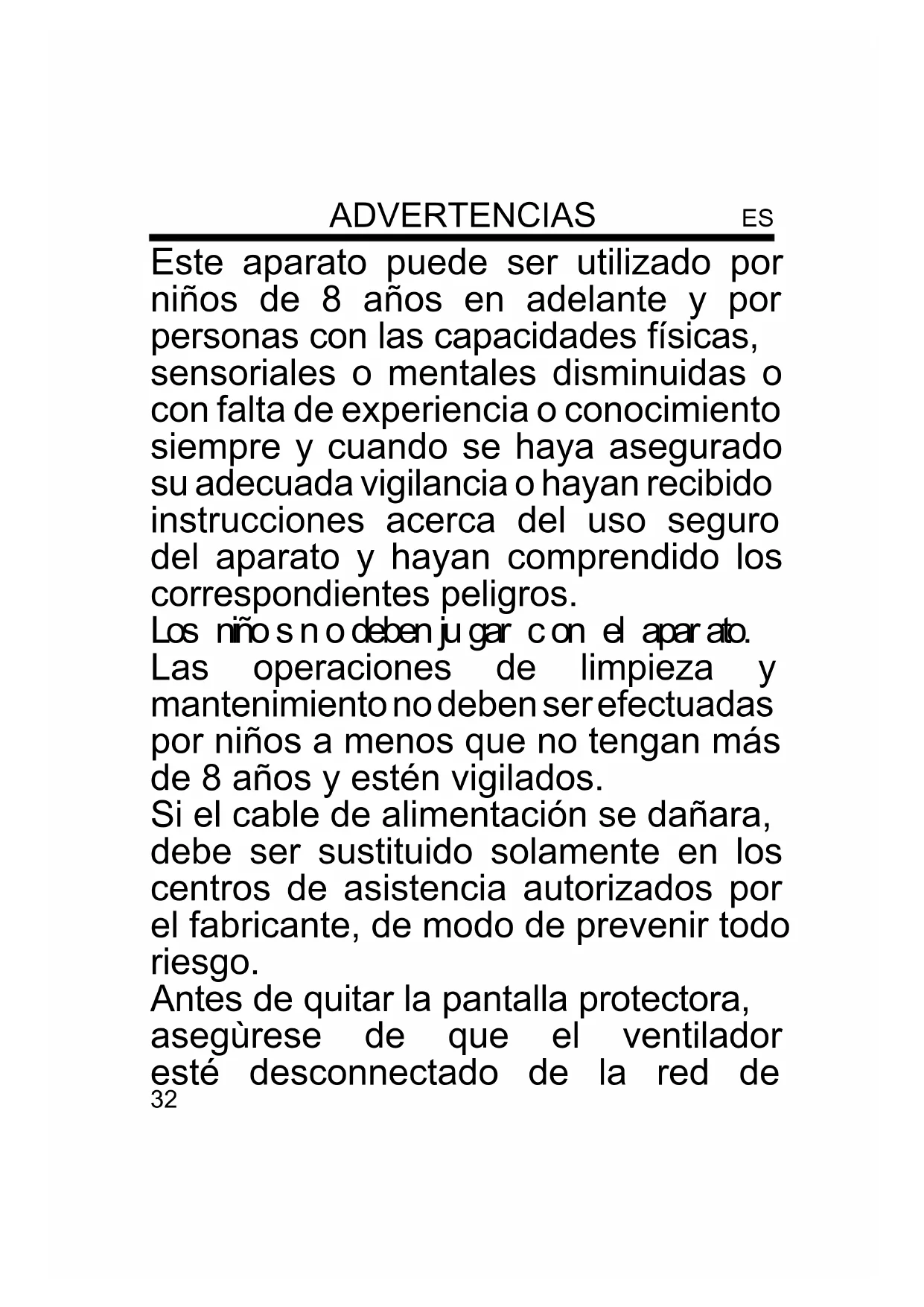 Antes de limpiar el aparato desconectarlo de la toma de corriente y dejarlo enfriar completamente. Para limpiar el aparato utilizar un paño suave y ligeramente humedecido. No utilizar absolutamente productos abrasivos o disolventes químicos. No utilizar sustancias, líquidos o paños excesivamente mojados ya que las posibles inltraciones podrían dañar el aparato de modo irreparable. NO SUMERGIR JAMAS EL APARATO EN EL AGUA. Reinstale la protección antes de conectar el enchufe a la corriente Antes de utilizarlo, compruebe que la rejilla de protección esté dien cerrada. MANTENIMIENTO37 ELIMINACIÓN