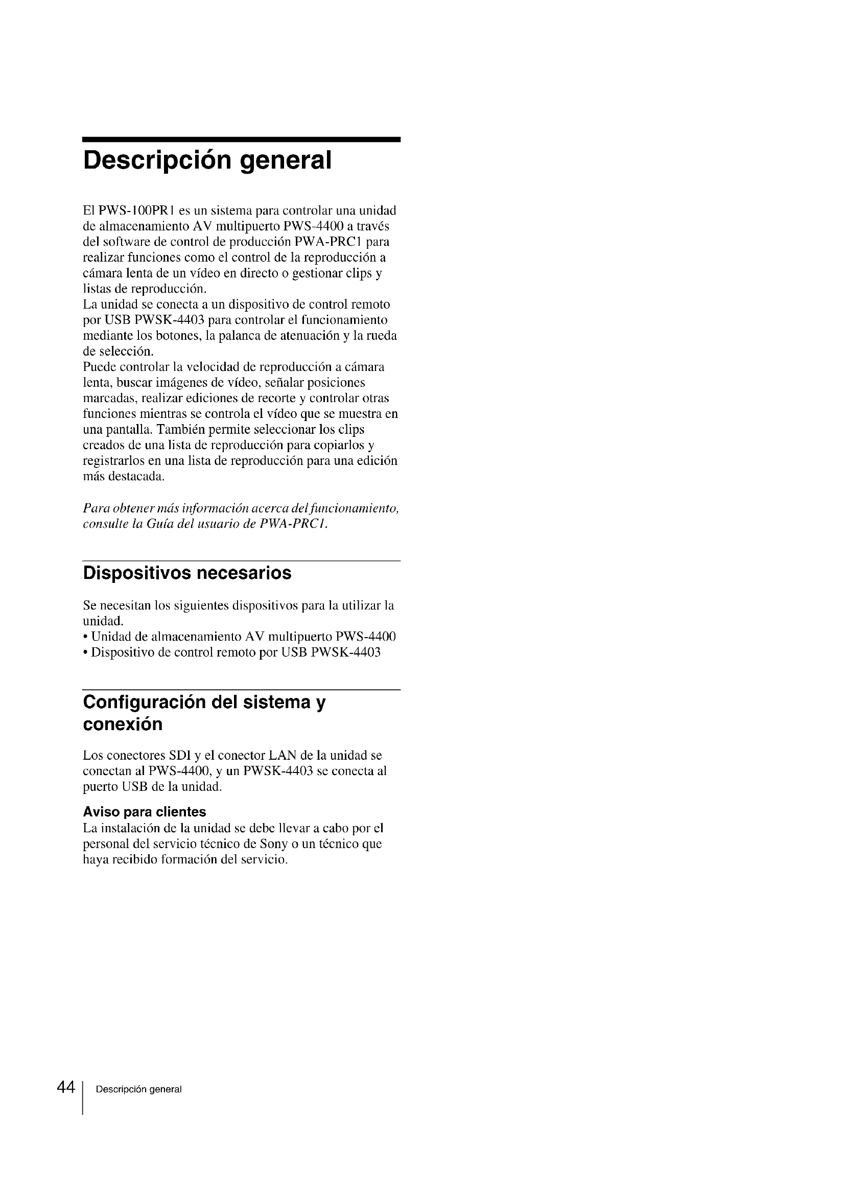 - Especificaciones Por seguridad, lea las precauciones descritas en la Guía de instrucciones de PWS-100 (suministrada). Español ESES44 Descripción general Descripción general El PWS-100PR1 es un sistema para controlar una unidad de almacenamiento AV multipuerto PWS-4400 a través del software de control de producción PWA-PRC1 para realizar funciones como el control de la reproducción a cámara lenta de un vídeo en directo o gestionar clips y listas de reproducción. La unidad se conecta a un dispositivo de control remoto por USB PWSK-4403 para controlar el funcionamiento mediante los botones, la palanca de atenuación y la rueda de selección. Puede controlar la velocidad de reproducción a cámara lenta, buscar imágenes de vídeo, señalar posiciones marcadas, realizar ediciones de recorte y controlar otras funciones mientras se controla el vídeo que se muestra en una pantalla. También permite seleccionar los clips creados de una lista de reproducción para copiarlos y registrarlos en una lista de reproducción para una edición más destacada. Para obtener más información acerca del funcionamiento, consulte la Guía del usuario de PWA-PRC1. Dispositivos necesarios Se necesitan los siguientes dispositivos para la utilizar la unidad. p. 50