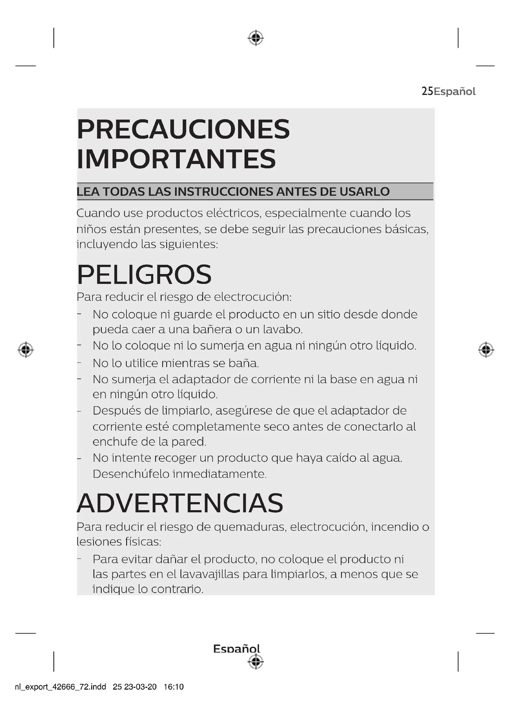 Para evitar dañar el producto, no coloque el producto ni las partes en el lavavajillas para limpiarlos, a menos que se indique lo contrario. 25Español LEA TODAS LAS INSTRUCCIONES ANTES DE USARLO idml_export_42666_72.indd 25 23-03-20 16:10- No use boquillas distintas de las recomendadas por el fabricante.