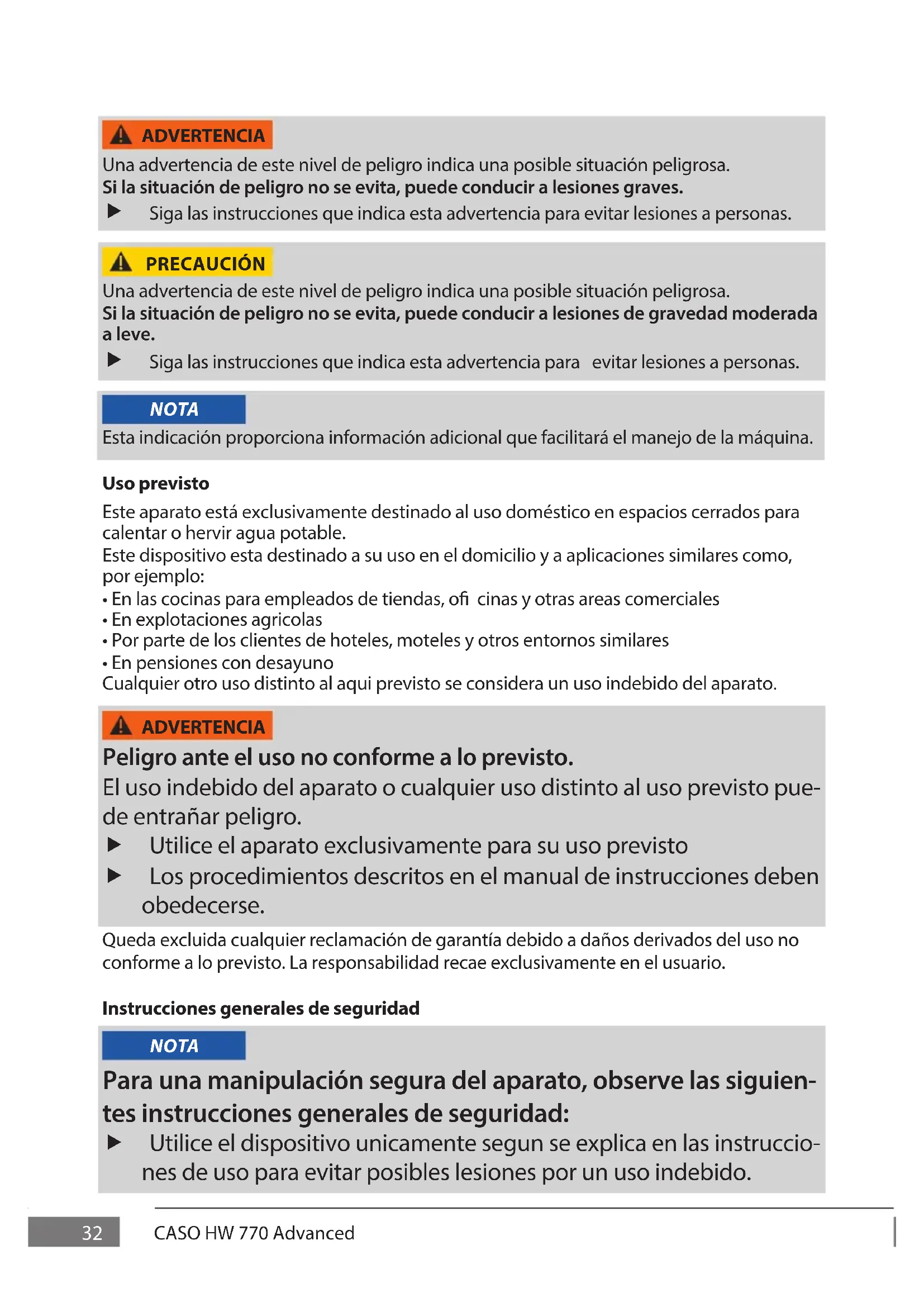 - La sicurezza elettrica dell’apparecchio viene garantita solo se ci si connette ad un conduttore di terra installato in conformità alle disposizioni. In caso di dubbio, faccia controllare l’installazione di casa mediante un tecnico elettricista specializzato. Il produttore non può essere considerato responsabile per danni, provocati da una conduttura di terra mancante o interrotta. ES Seguridad Advertencias En el presente manual se utilizan las siguientes advertencias: PELIGRO Una advertencia de este nivel de peligro indica una situación peligrosa. Si la situación peligrosa no se evita, puede causar la muerte o lesiones graves. Siga las instrucciones que indica esta advertencia para evitar el peligro de muerte o de lesiones graves a personas.32 CASO HW 770 Advanced ADVERTENCIA Una advertencia de este nivel de peligro indica una posible situación peligrosa. Si la situación de peligro no se evita, puede conducir a lesiones graves. Siga las instrucciones que indica esta advertencia para evitar lesiones a personas. PRECAUCIÓN Una advertencia de este nivel de peligro indica una posible situación peligrosa. Si la situación de peligro no se evita, puede conducir a lesiones de gravedad moderada a leve. Siga las instrucciones que indica esta advertencia para evitar lesiones a personas. Esta indicación proporciona información adicional que facilitará el manejo de la máquina. Uso previsto Este aparato está exclusivamente destinado al uso doméstico en espacios cerrados para calentar o hervir agua potable. Este dispositivo esta destinado a su uso en el domicilio y a aplicaciones similares como, por ejemplo: