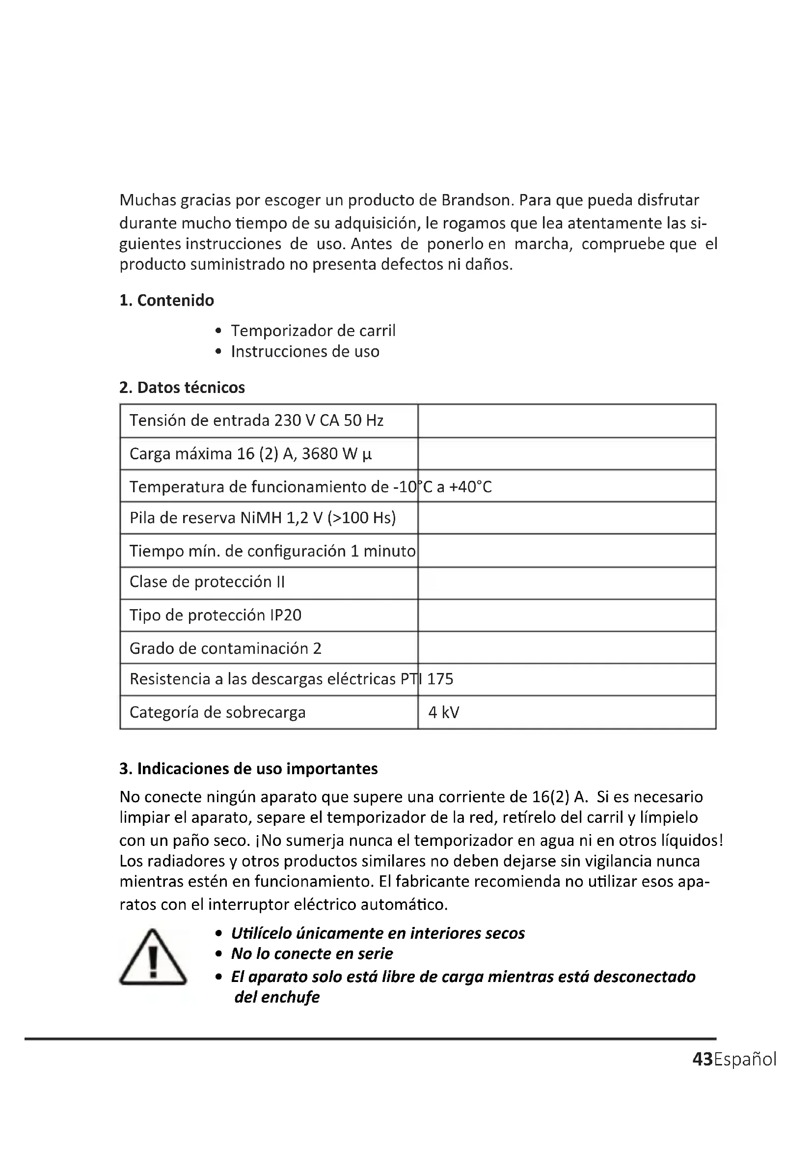 No convecte ningún aparato que supere una corriente de 16(2) A. Si esnecessary limpiar el aparato, separe el temporizador de la red, retirelo del carril y limpielo con un paño seco. iNo sumerja nunca el temporizador en agua ni en otros liquidos! Los radiadores yotiros productos similares no deben dejarse sin vigilancia nunca)msteads estén en functionamento. El fabricante recomienda no utilizearthose aparatos con el interruptor eletrico automático.