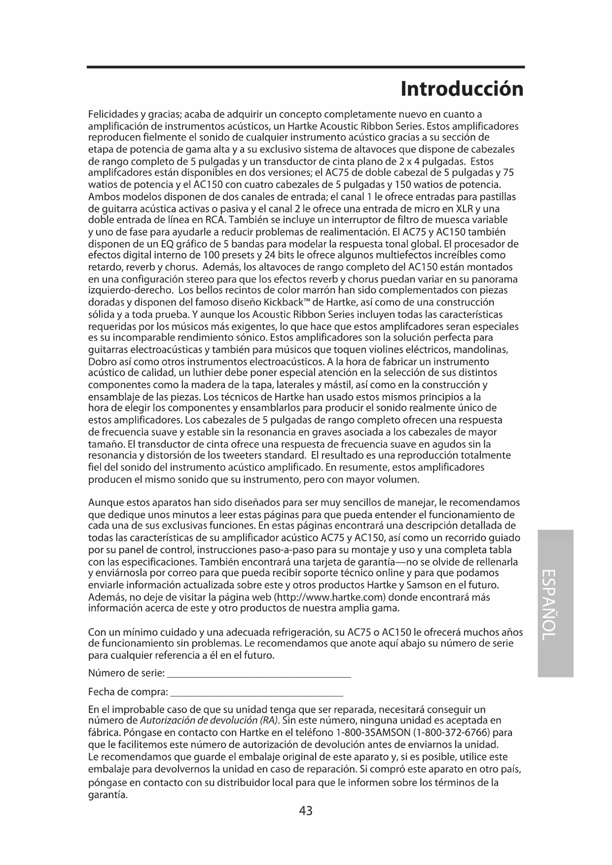Aúnque这些东西 aparatos han sido disnadaos para ser muy sencillos de manejar, le recomendamos que dedique uno minuto a leer estas páginas para que pueda entender el funcionaimiento de cada una de sus exclusivas unidades. En estas páginas encontrará una descripción detallada de todas las caracteristicas de su amplificador acústico AC75 y AC150, asi como un recorro信息服务 por su panel de control, instrucciones paso-a-paso para su montaje y uso y una completenessa tablet con las specifications. también encontrará una tarjeta de garantía—no se olvide de rellenarla y enviarnosla por correto para que pueda recibir soporte技术和 online y para que podamos enviarle informaciónactualizada sobre este y otros productos Hartke y Samson en el futuro. Además, no deje de visitar la网页 web (http://www.hartke.com) donde encontrará más información acerca de este y otro productos de nuestra amplia gama.