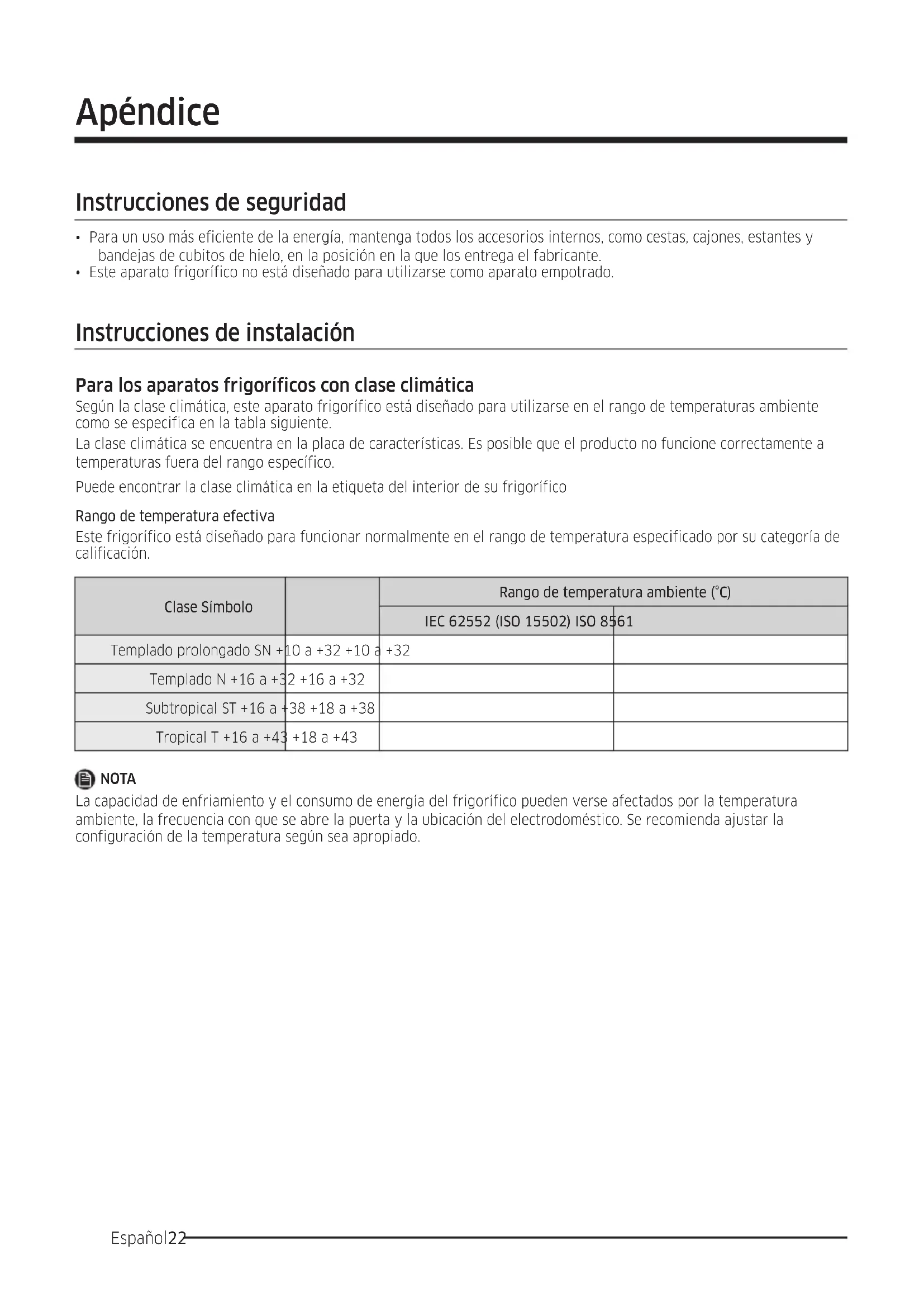 - Este aparato frigorífico no está diseñado para utilizarse como aparato empotrado. Instrucciones de instalación Para los aparatos frigoríficos con clase climática Según la clase climática, este aparato frigorífico está diseñado para utilizarse en el rango de temperaturas ambiente como se especifica en la tabla siguiente. La clase climática se encuentra en la placa de características. Es posible que el producto no funcione correctamente a temperaturas fuera del rango específico. Puede encontrar la clase climática en la etiqueta del interior de su frigorífico Rango de temperatura efectiva Este frigorífico está diseñado para funcionar normalmente en el rango de temperatura especificado por su categoría de calificación. Clase Símbolo Rango de temperatura ambiente (°C)