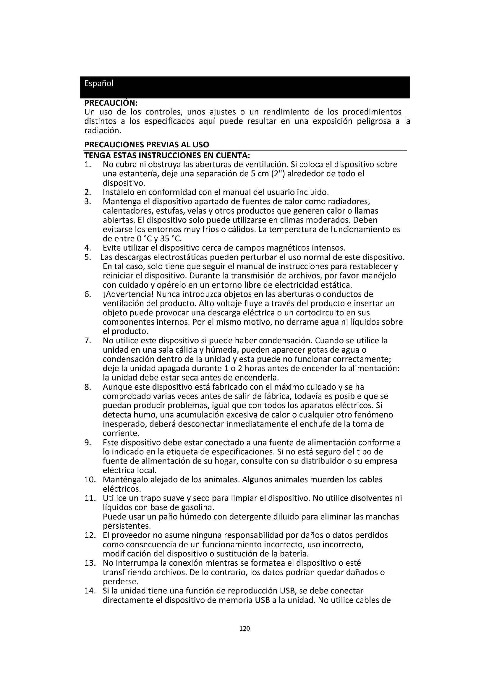 20. Nunca coloque el dispositivo sobre otros equipos eléctricos.