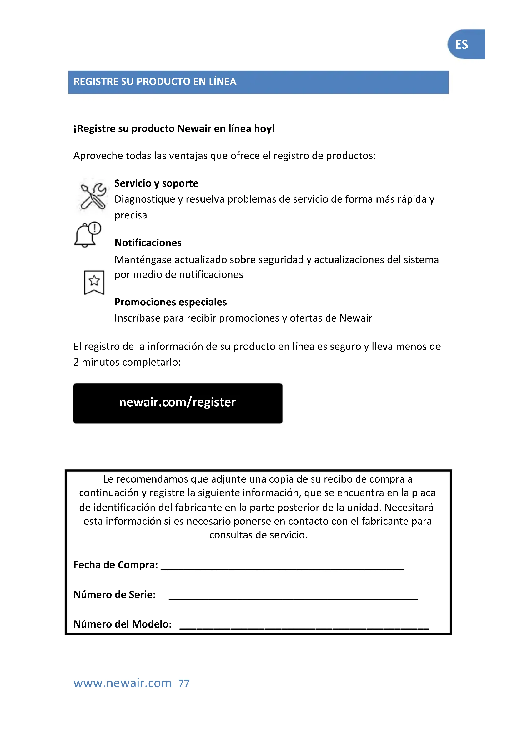 Cuando haga un reclamo de garantía,onga disponible la factura de compra original con la Fecha de compra. Una vez confirmado que su electrodomésico eseligible para el service de garantía, todas las reparaciones serán realizadas por un centro de reparación autorizada de Newair ^TM . El comprador sera responsable de los gastos de traslado o transporte. Las piezas y / o unidades de reemplazo serontniervas, refabricadas o reacondicionadas y estar susjetas a la disreción del fabricante. Para soporte技术和servicio de garantía,envie un correo electrónico a support@newairusa.com.