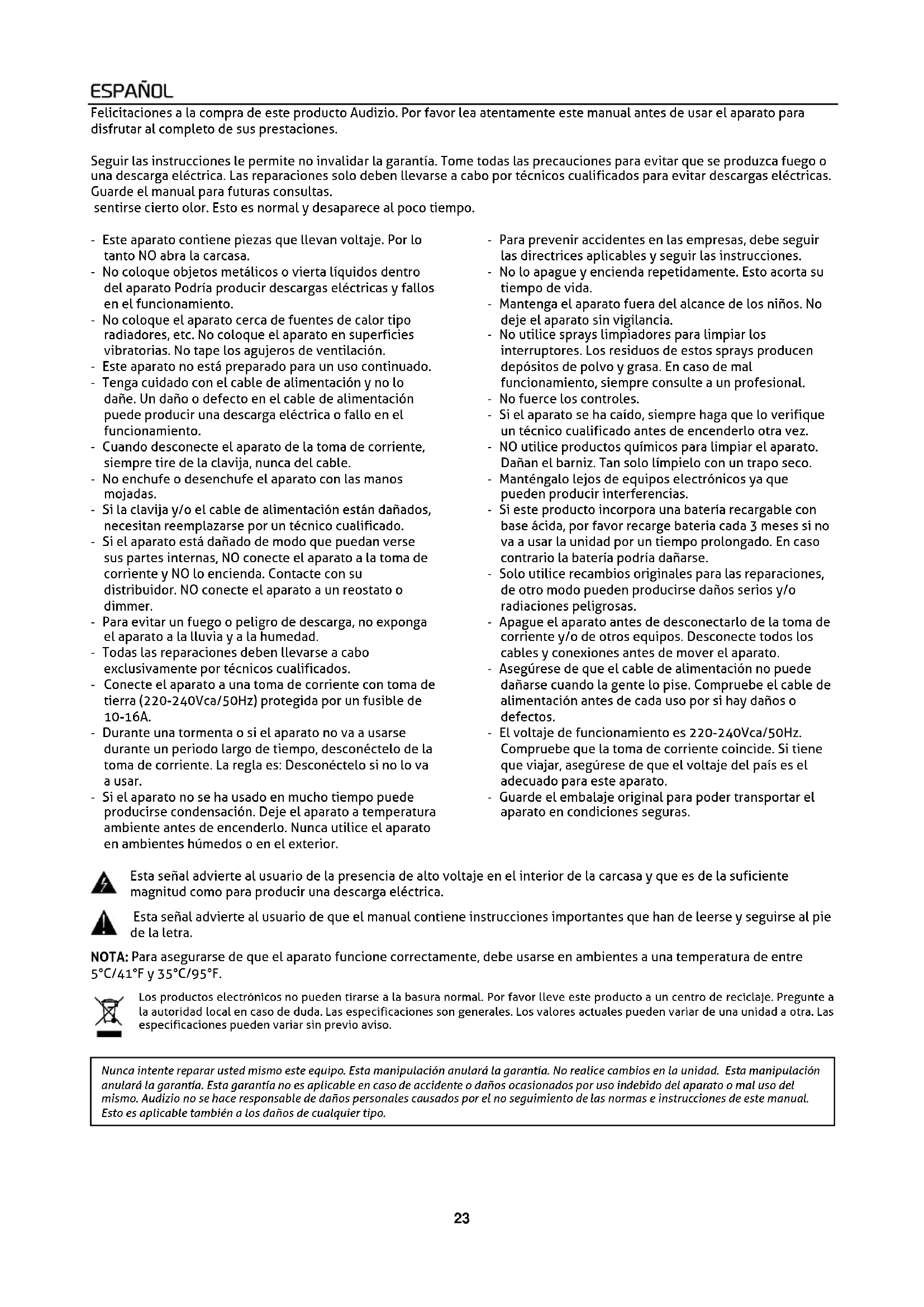 Nunca intente reparar usted mismo este equipo. Esta manipulación anulará la garantía. No realice cambios en la unidad. Esta manipulación anulará la garantía. Esta garantía no es aplicable en caso de accidente o daños ocasionados por uso indebido del aparato o mal uso del mismo. Audizio no se hace responsable de daños personales causados por el no seguimiento de las normas e instrucciones de este manual. Esto es aplicable también a los daños de cualquier tipo.