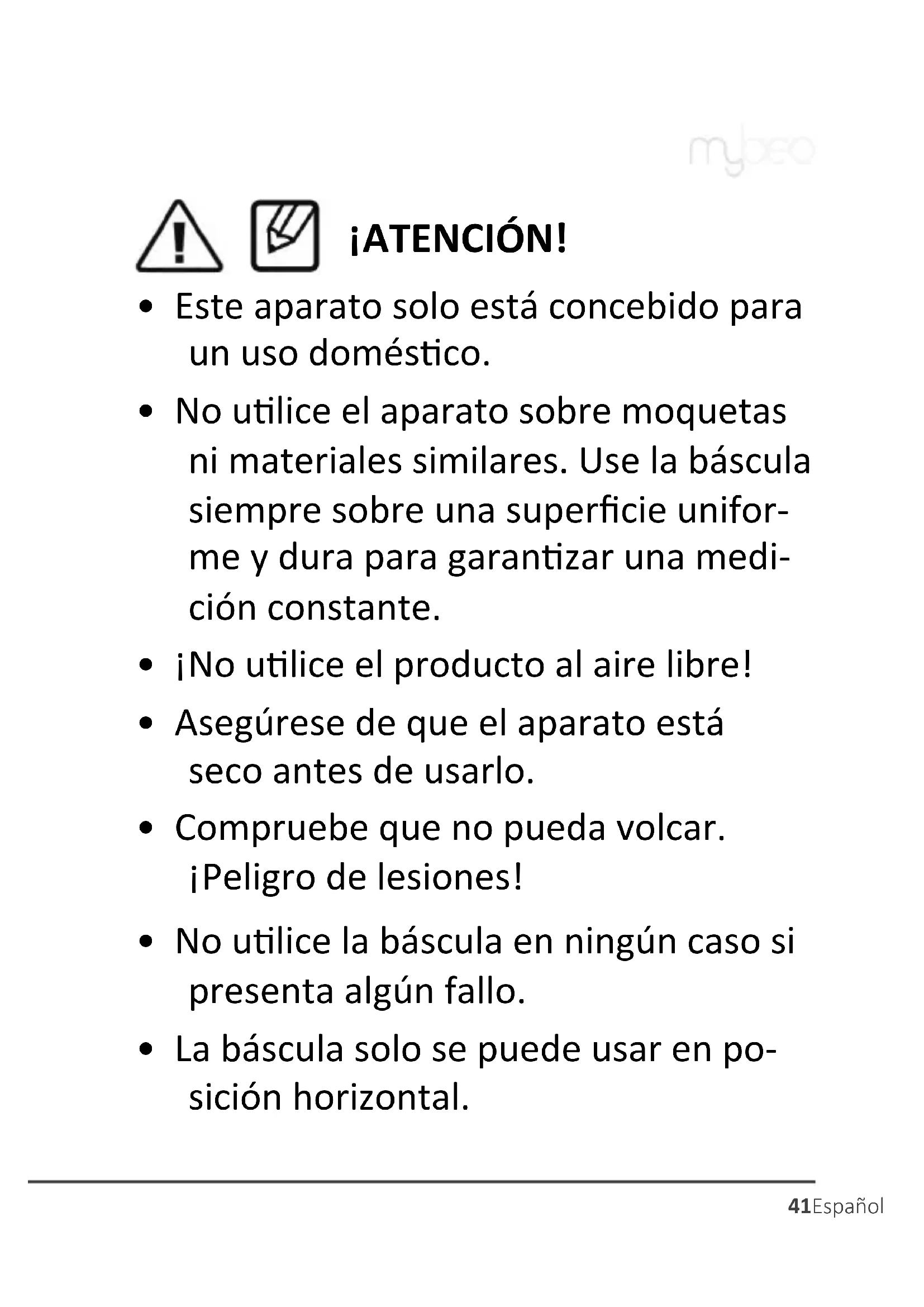 No utilise el aparato sobre moquetas ni materiales similares. Use la báscula siempre sobre una superficie uniforme y dura para garantizar una medicación constante.