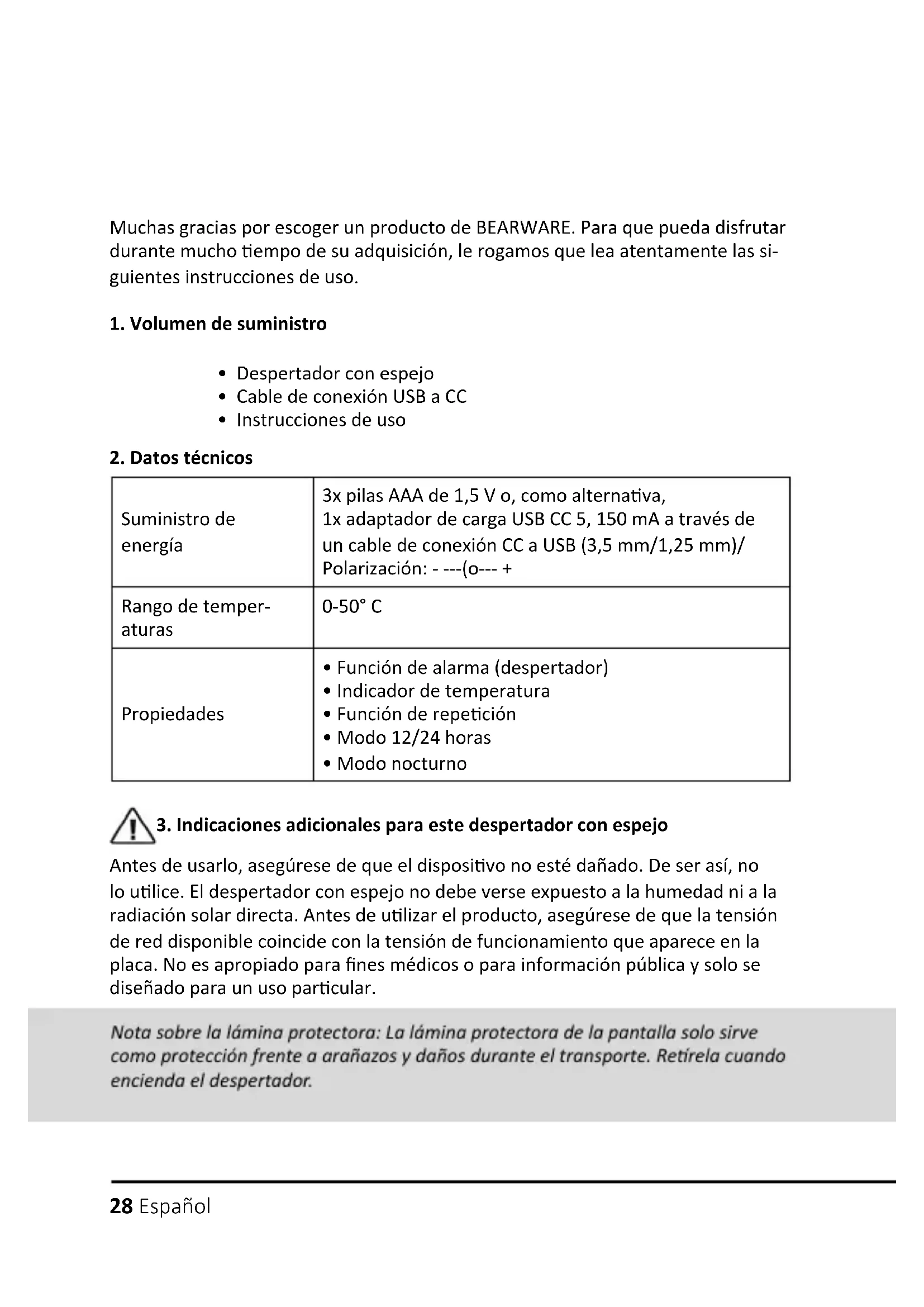Antes de usarlo, asegürese de que el dispositivo no está dañado. De ser asi, no lo utilizes. El despertador con espejo no debe verse expuesto a la humedad ni a la radiación solar directa. Antes de utiliser el producto, asegürese de que la tensión de red disponible coincide con la tensión de funciona bajo que aparece en la placà. No es apropiado para fines médicos o para información Pública y solo se diseñado para un uso particular.
