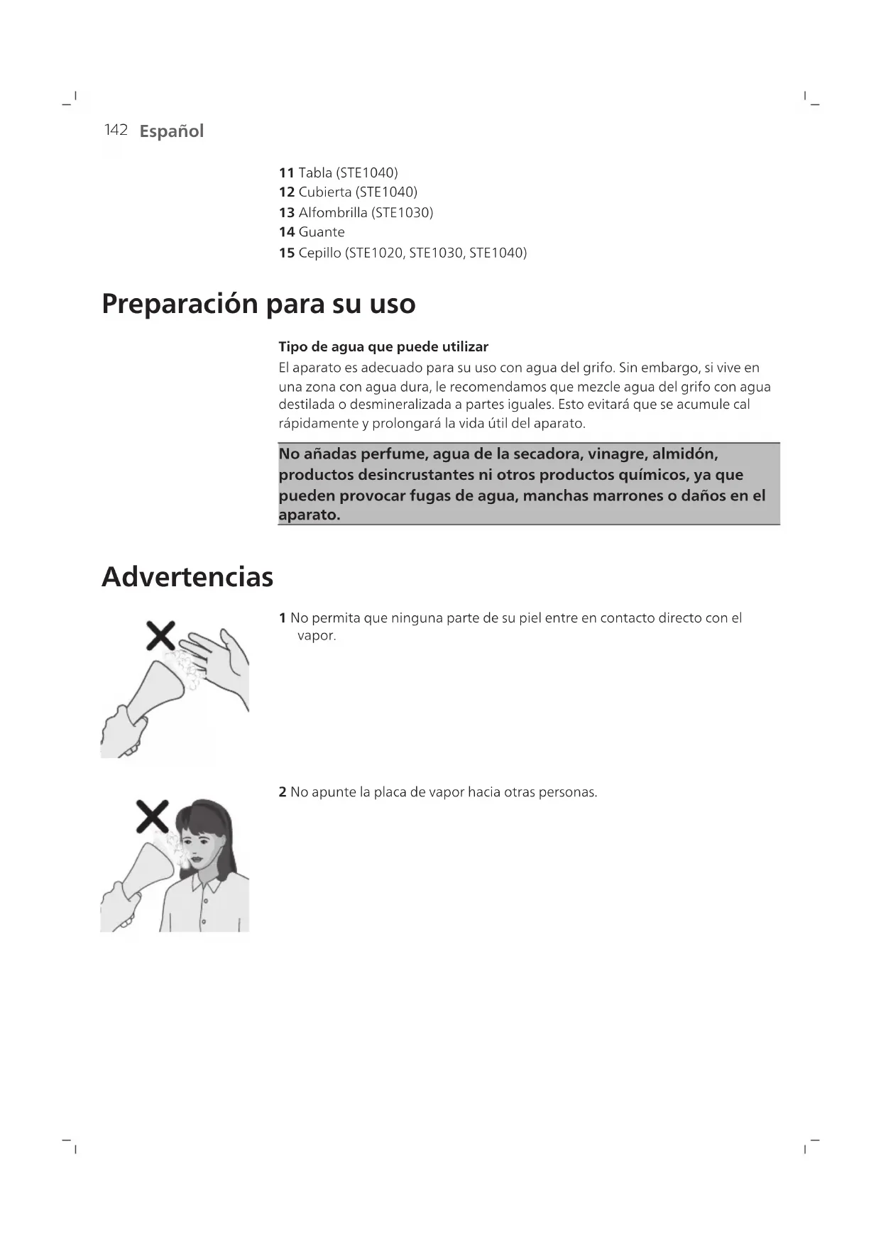 1 Cabezal del vaporizador 2 Manguera de vapor 3 Base del vaporizador 4 Percha (STE1011, STE1020, STE1030, STE1040) 5 Pinza de bloqueo del poste 6 Poste 7 Control del vapor 8 Base 9 Rueda De-calc 10 Depósito de agua142 Español 11 Tabla (STE1040) 12 Cubierta (STE1040) 13 Alfombrilla (STE1030) 14 Guante 15 Cepillo (STE1020, STE1030, STE1040) Preparación para su uso Tipo de agua que puede utilizar El aparato es adecuado para su uso con agua del grifo. Sin embargo, si vive en una zona con agua dura, le recomendamos que mezcle agua del grifo con agua destilada o desmineralizada a partes iguales. Esto evitará que se acumule cal rápidamente y prolongará la vida útil del aparato. No añadas perfume, agua de la secadora, vinagre, almidón, productos desincrustantes ni otros productos químicos, ya que pueden provocar fugas de agua, manchas marrones o daños en el aparato. Advertencias 1 No permita que ninguna parte de su piel entre en contacto directo con el vapor. 2 No apunte la placa de vapor hacia otras personas.143 Español 3 No sostenga la prenda de manera que entre en contacto directo con el vapor. 4 No utilice el cabezal del vaporizador boca abajo. 5 No doble la manguera para vaporizar la prenda. > 5 min. 6 No deje el vaporizador vertical sin supervisión durante más de 5 minutos.144 Español