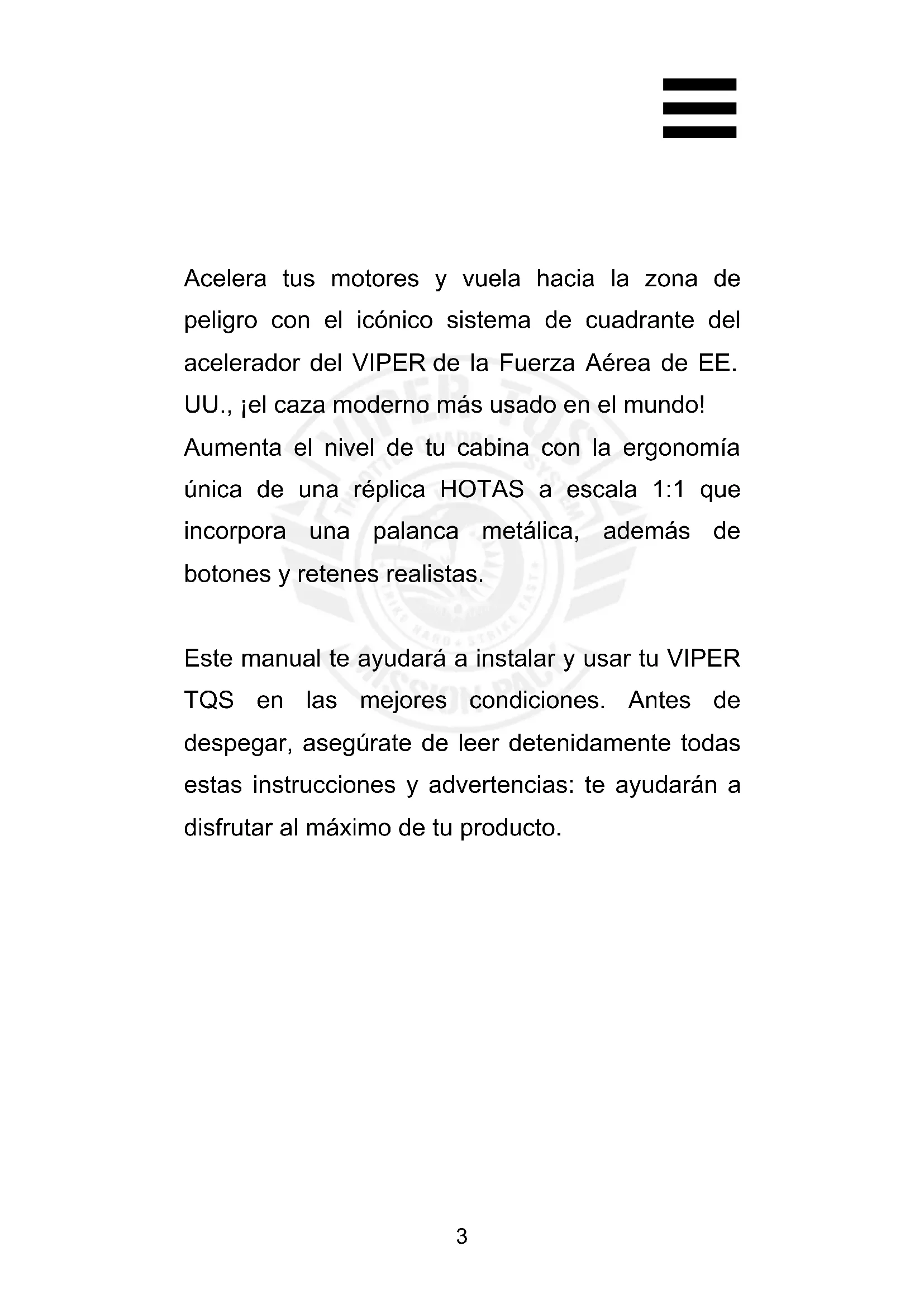 Acelera tus motores y vuela hacia la zona de peligro con el icónico sistema de cuadrante del acelerador del VIPER de la Fuerza Aérea de EE. UU., ¡el caza moderno más usado en el mundo! Aumenta el nivel de tu cabina con la ergonomía única de una réplica HOTAS a escala 1:1 que incorpora una palanca metálica, además de botones y retenes realistas. Este manual te ayudará a instalar y usar tu VIPER TQS en las mejores condiciones. Antes de despegar, asegúrate de leer detenidamente todas estas instrucciones y advertencias: te ayudarán a disfrutar al máximo de tu producto.4