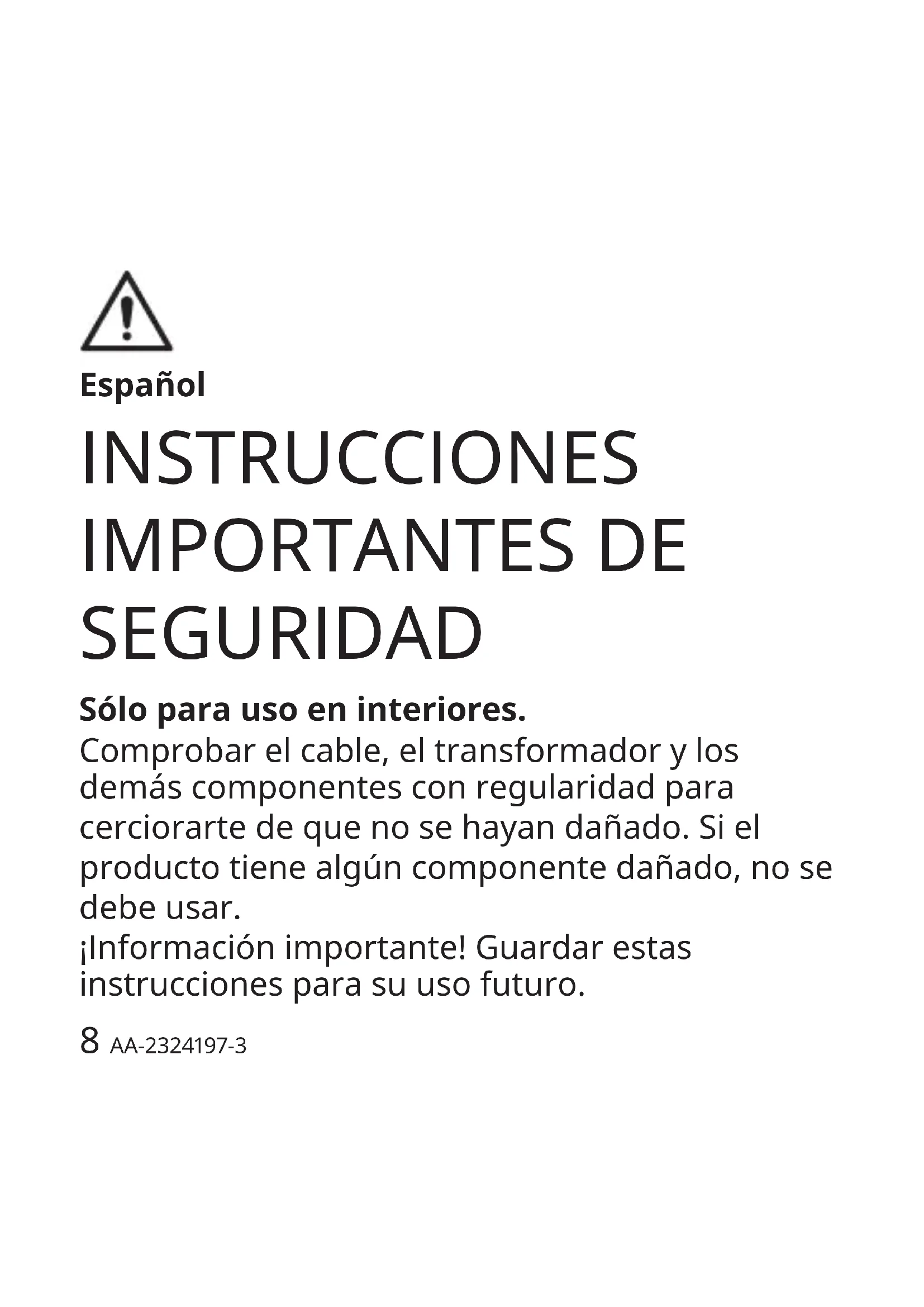 Español INSTRUCCIONES IMPORTANTES DE SEGURIDAD Sólo para uso en interiores. Comprobar el cable, el transformador y los demás componentes con regularidad para cerciorarte de que no se hayan dañado. Si el producto tiene algún componente dañado, no se debe usar. ¡Información importante! Guardar estas instrucciones para su uso futuro.9 ¡ADVERTENCIA! La fuente de luz de este producto se compone de diodos luminosos (LED) que no pueden reemplazarse. Este producto no se debe desmontar, ya que los diodos luminosos pueden cuasar daños a los ojos. No se debe sumergir en agua. Limpieza Utiliza un paño húmedo. Evita utilizar detergentes fuertes.10 AA-2324197-3 Español