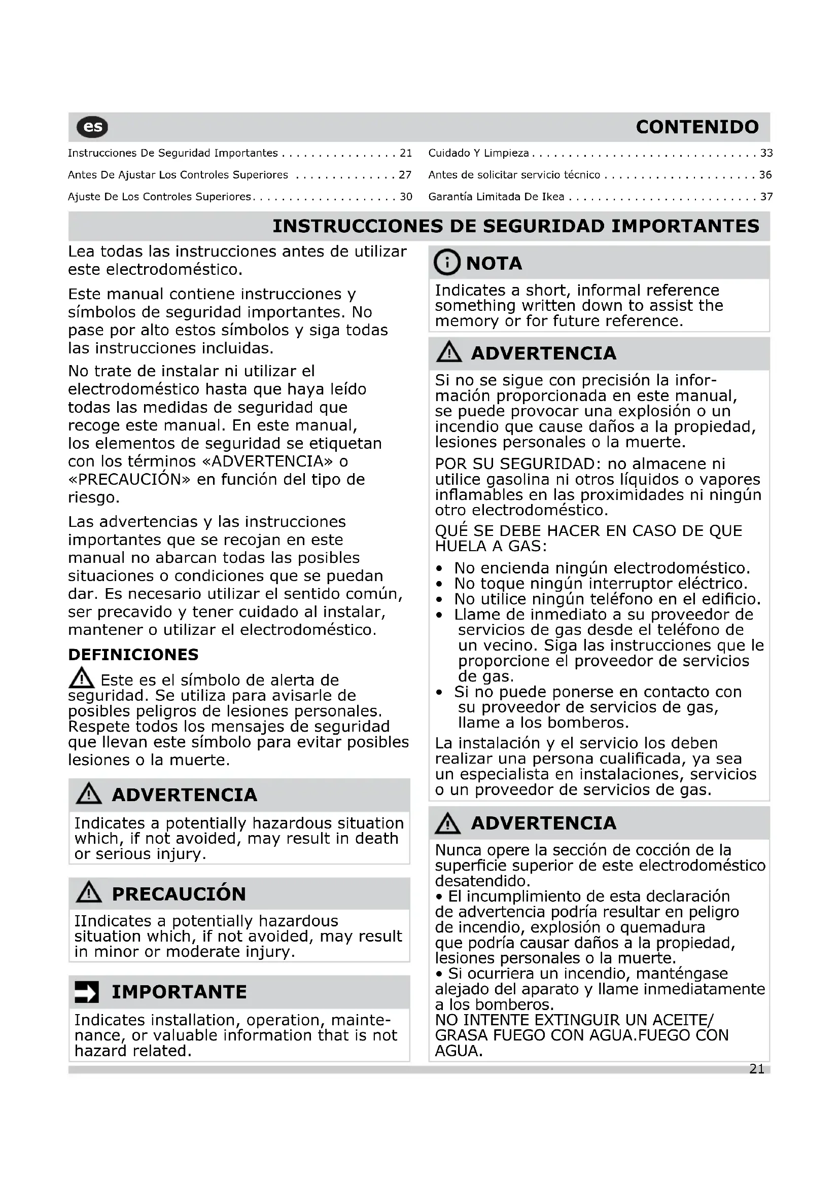 - Garantía Limitada De Ikea ADVERTENCIA Nunca opere la sección de cocción de la supercie superior de este electrodoméstico desatendido. p. 37
