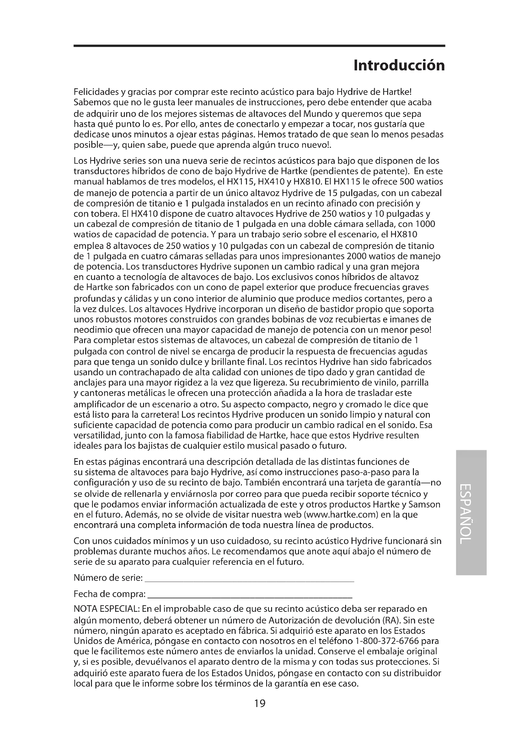 Felicidades y gracias por comprar este recinto acústico para bajo Hydrive de Hartke! Sabemos que no le gusta leer manuales de instrucciones, pero debe entender que acaba de adquirir uno de los mejores sistemas de altavoces del Mundo y queremos que sepa hasta qué punto lo es. Por ello, antes de conectarlo y empezar a tocar, nos gustaría que dedicase unos minutos a ojear estas páginas. Hemos tratado de que sean lo menos pesadas posible—y, quien sabe, puede que aprenda algún truco nuevo!.