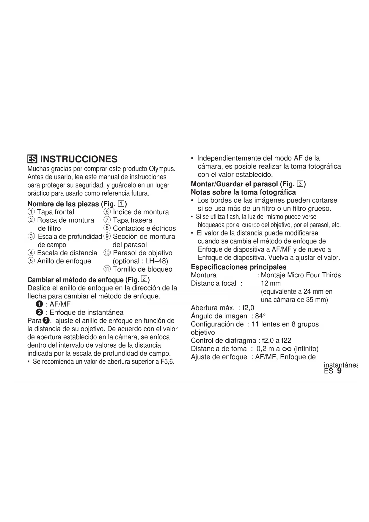 - ES 9 INSTRUCCIONES Muchas gracias por comprar este producto Olympus. Antes de usarlo, lea este manual de instrucciones para proteger su seguridad, y guárdelo en un lugar práctico para usarlo como referencia futura. Nombre de las piezas (Fig. 1) 1 Tapa frontal 2 Rosca de montura de filtro
