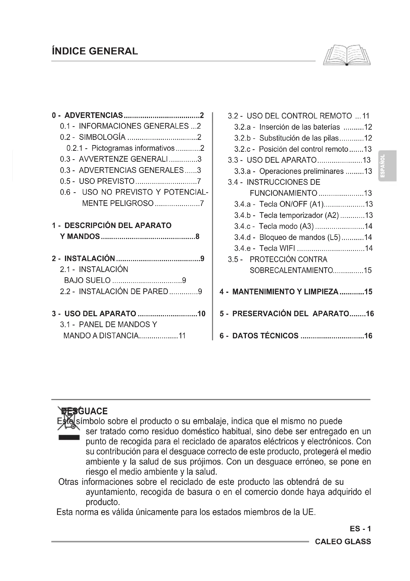 Este aparato debe utilizarse únicamente según las especi- cacionesindicadasenelpresentemanual.Unusodiferente delespecicadopuedecomportargravesaccidentes. EL FABRICANTE DECLINA TODA RESPONSABILIDAD POR CUAL- QUIER DAÑO PERSONAL O MATERIAL OCASIONADO POR EL IN- CUMPLIMIENTO DE LAS NORMAS ILUSTRADAS EN ESTE MANUAL.CALEO GLASS ESPAÑOL ES - 9