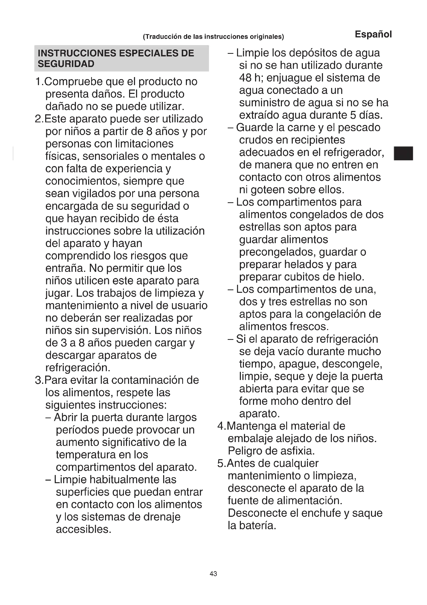SEGURIDAD 1.Compruebe que el producto no presenta daños. El producto dañado no se puede utilizar. 2.Este aparato puede ser utilizado por niños a partir de 8 años y por personas con limitaciones físicas, sensoriales o mentales o con falta de experiencia y conocimientos, siempre que sean vigilados por una persona encargada de su seguridad o que hayan recibido de ésta instrucciones sobre la utilización del aparato y hayan comprendido los riesgos que entraña. No permitir que los niños utilicen este aparato para jugar. Los trabajos de limpieza y mantenimiento a nivel de usuario no deberán ser realizadas por niños sin supervisión. Los niños de 3 a 8 años pueden cargar y descargar aparatos de refrigeración. 3.Para evitar la contaminación de los alimentos, respete las siguientes instrucciones: – Abrir la puerta durante largos períodos puede provocar un aumento significativo de la temperatura en los compartimentos del aparato. – Limpie habitualmente las superficies que puedan entrar en contacto con los alimentos y los sistemas de drenaje accesibles. – Limpie los depósitos de agua si no se han utilizado durante 48 h; enjuague el sistema de agua conectado a un suministro de agua si no se ha extraído agua durante 5 días. – Guarde la carne y el pescado crudos en recipientes adecuados en el refrigerador, de manera que no entren en contacto con otros alimentos ni goteen sobre ellos. – Los compartimentos para alimentos congelados de dos estrellas son aptos para guardar alimentos precongelados, guardar o preparar helados y para preparar cubitos de hielo. – Los compartimentos de una, dos y tres estrellas no son aptos para la congelación de alimentos frescos. – Si el aparato de refrigeración se deja vacío durante mucho tiempo, apague, descongele, limpie, seque y deje la puerta abierta para evitar que se forme moho dentro del aparato. 4.Mantenga el material de embalaje alejado de los niños. Peligro de asfixia. 5.Antes de cualquier mantenimiento o limpieza, desconecte el aparato de la fuente de alimentación. Desconecte el enchufe y saque la batería. 2024/03/21 11:56:13Stylesheet: EU Ver 2024.3.12 UL18DF_C99750371_311_EUEspañol