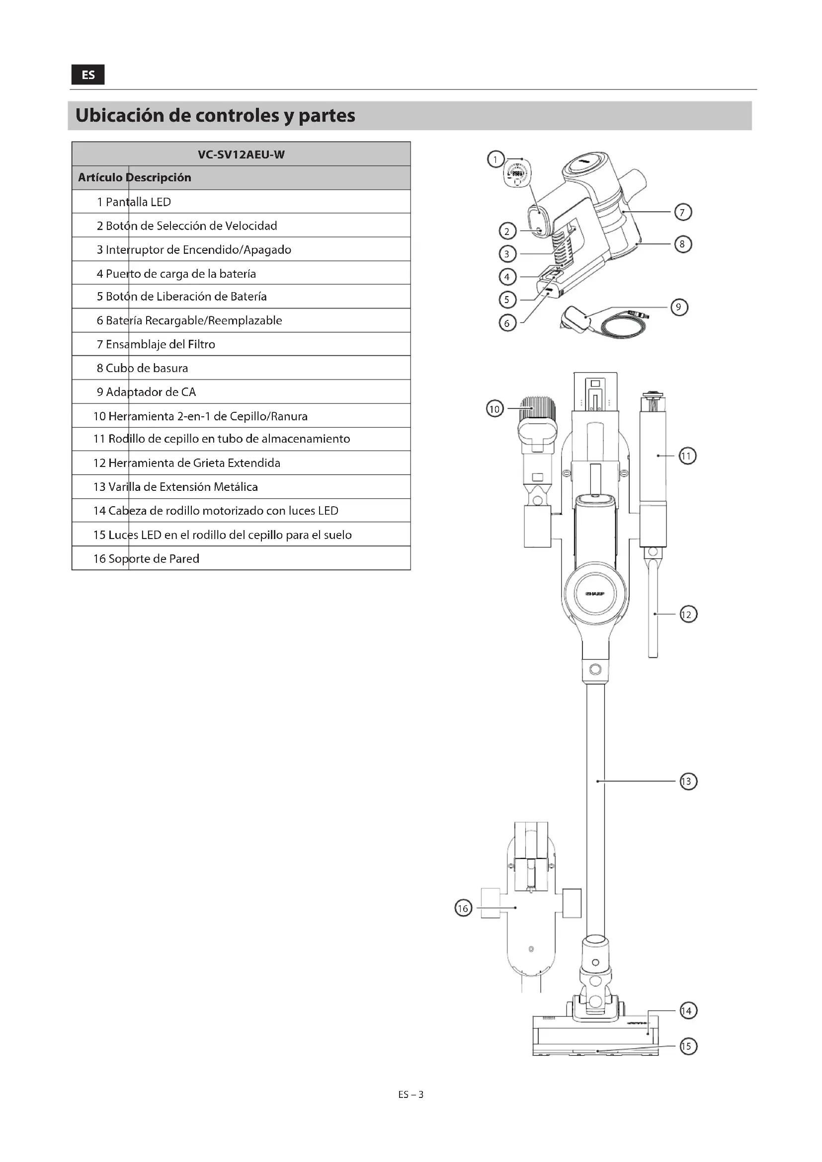 ES – 2 ES – 2 Introducción Este sistema de aspiradora de palo sin cable cuenta con un motor digital inteligente con pantalla LED, paquete de baterías Li-Ion extraíble. Es ligero y versátil y se convierte fácilmente de aspiradora de palo para toda la casa a aspiradora de mano para limpieza de manchas con las diversas herramientas de accesorios. Contenido de la caja Artículo Descripción VC-SV12AEU-W VC-SV20AEU-S VC-SV28AEU-B 1 Aspiradora (sin accesorios o batería) 2 Mini Rodillo de Cepillo Motorizado ×× 3 Adaptador de exión exible × 4 Herramienta 2-en-1 de Cepillo/Ranura 5 Herramienta de Cepillo Ancho ×× 6 Herramienta de Grieta Extendida 7 Manguera de Extensión ×× 8 Varilla de Extensión Metálica 9 Rodillo de cepillo motorizado con rodillo(s) instalado(s) 10 V-Rodillo 11 Rodillo de cepillo 12 Adaptador de Corriente (EU/UK) 13 Soporte de Pared para Almacenamiento