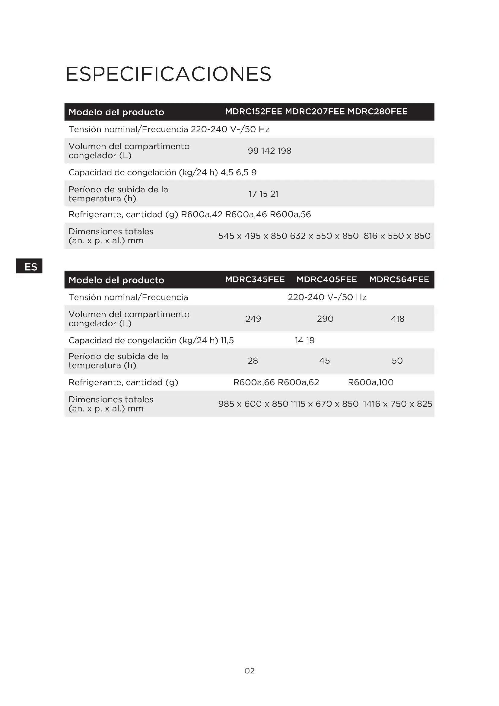 Tensión nominal/Frecuencia 220-240V~/50Hz Volumen del compartimento congelador (L)
