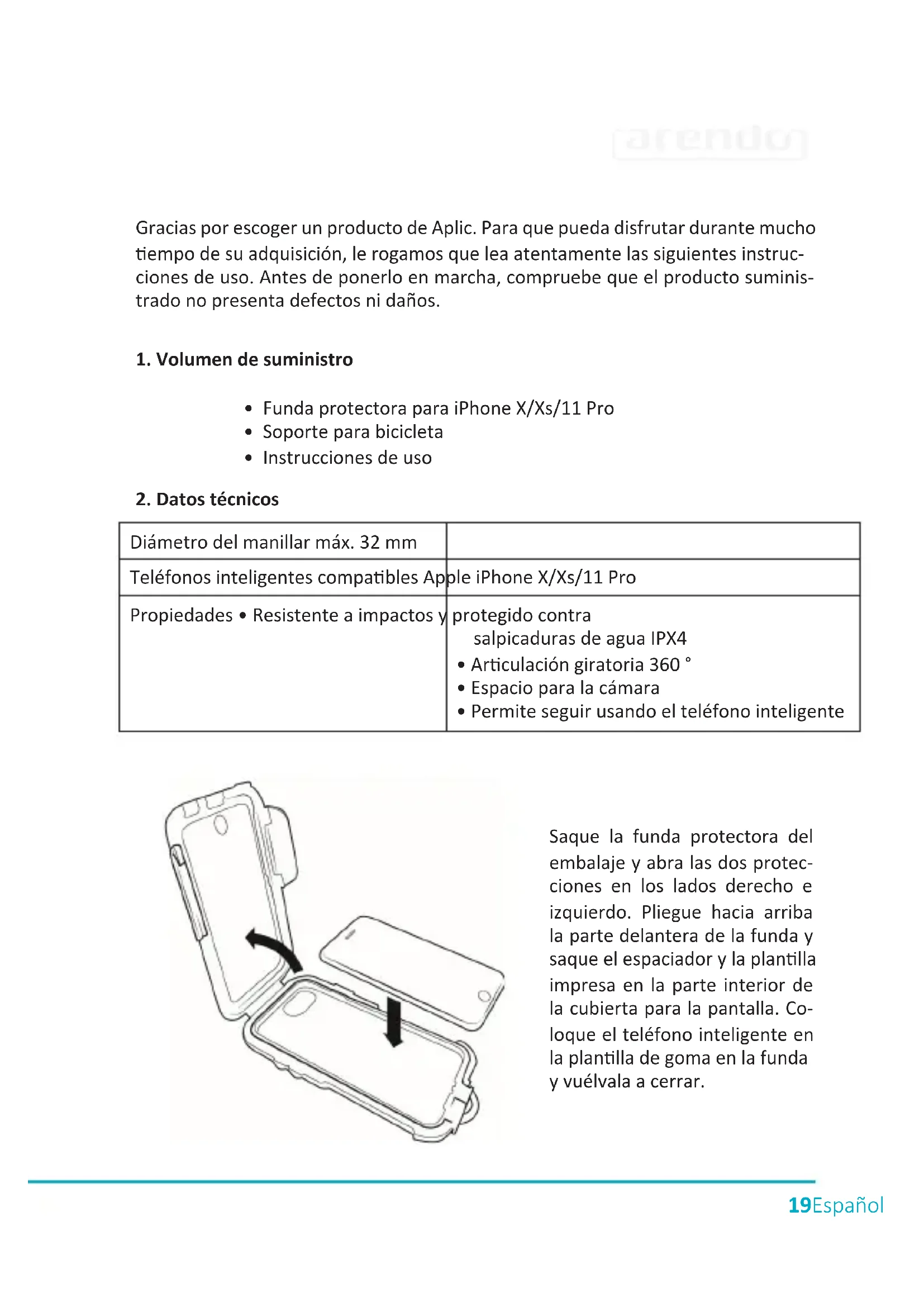 Saque la funda protectora del embalaje y abra las dos protecciones en los lados derecho e izquierdo. Pliegue hacer arriba la parte delantera de la funda y saque el espaciador y la plantilla impresa en la parte inferior de la cubierta para la pantalla. Coloque el Telefono inteligente en la plantilla de goma en la funda y vuélvala a cerrar.