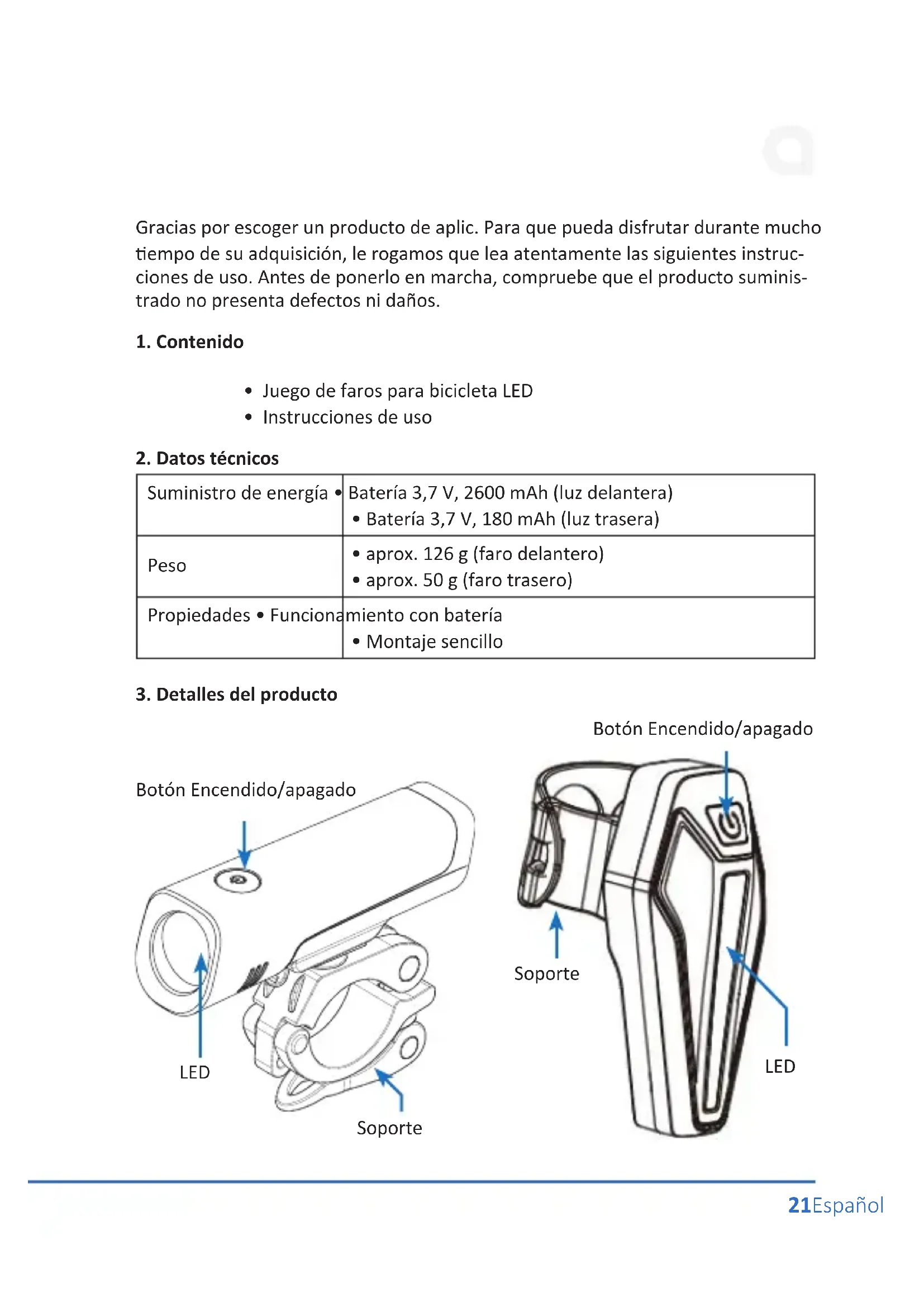 | Peso | aprox. 126 g (faro delantero)aprox. 50 g (faro trasero) |