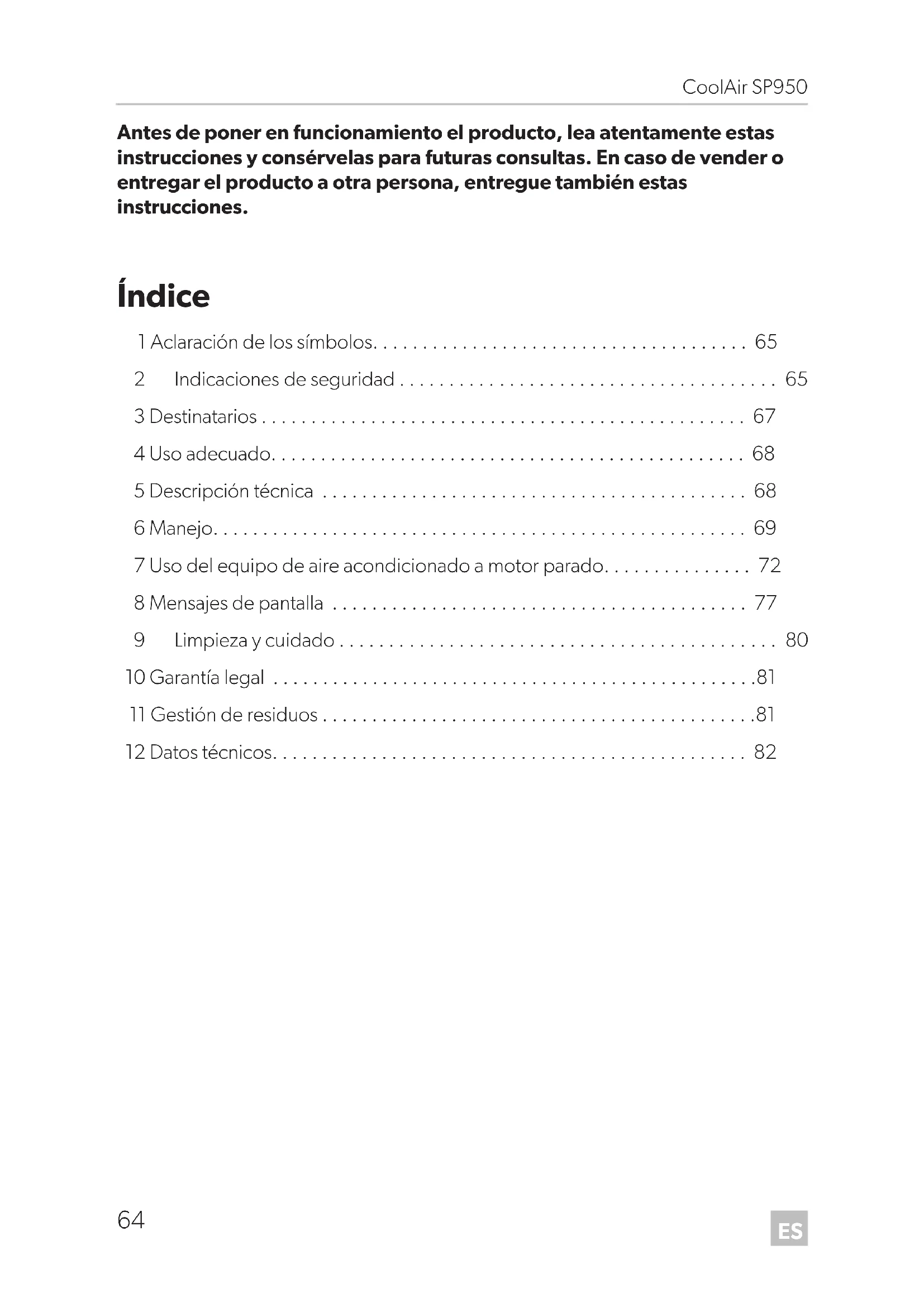 - Antes de poner en funcionamiento el producto, lea atentamente estas instrucciones y consérvelas para futuras consultas. En caso de vender o entregar el producto a otra persona, entregue también estas instrucciones. Índice 1 Aclaración de los símbolos p. 65
