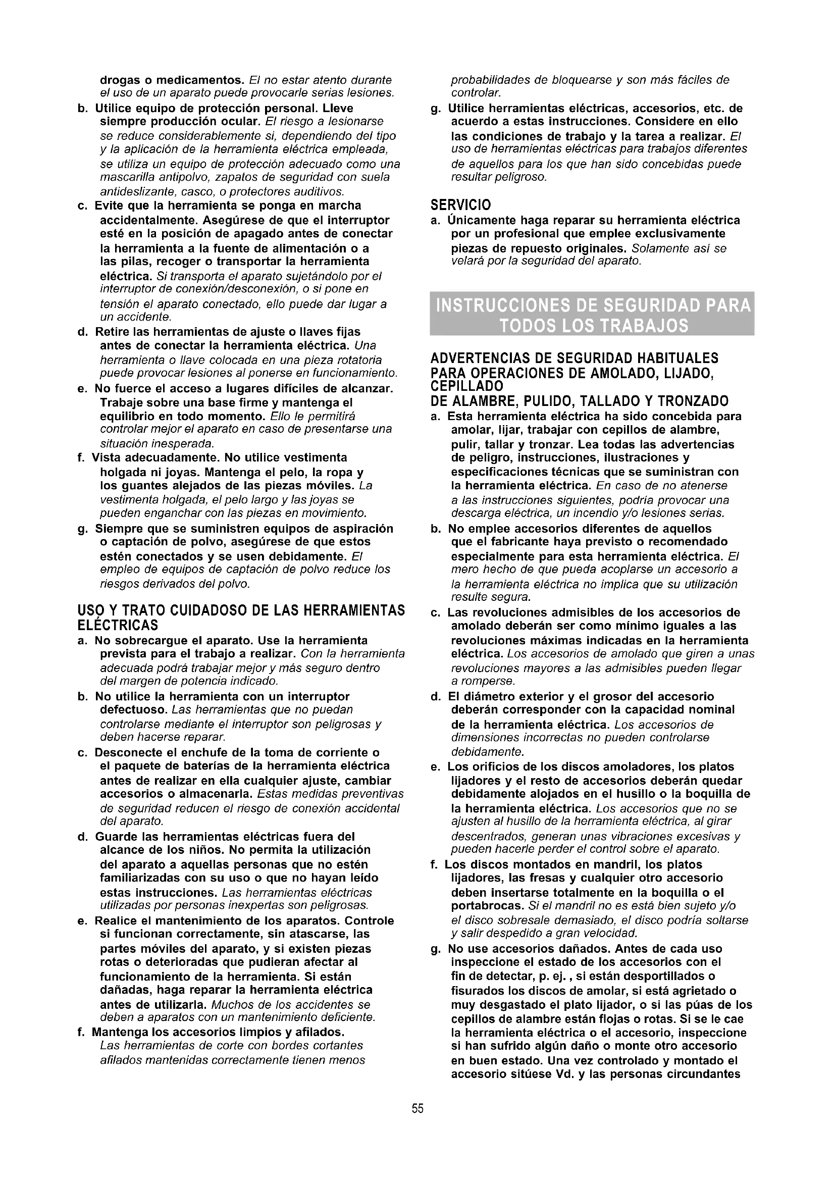 a. Esta herramienta eléctrica ha sido concebida para amolar, lijar, trabajar con cepillos de alambre, pulir, tallar y tronzar. Lea todas las advertencias de peligro, instrucciones, ilustraciones y especicaciones técnicas que se suministran con la herramienta eléctrica. En caso de no atenerse a las instrucciones siguientes, podría provocar una descarga eléctrica, un incendio y/o lesiones serias. b. No emplee accesorios diferentes de aquellos que el fabricante haya previsto o recomendado especialmente para esta herramienta eléctrica. El mero hecho de que pueda acoplarse un accesorio a la herramienta eléctrica no implica que su utilización resulte segura. c. Las revoluciones admisibles de los accesorios de amolado deberán ser como mínimo iguales a las revoluciones máximas indicadas en la herramienta eléctrica. Los accesorios de amolado que giren a unas revoluciones mayores a las admisibles pueden llegar a romperse. d. El diámetro exterior y el grosor del accesorio deberán corresponder con la capacidad nominal de la herramienta eléctrica. Los accesorios de dimensiones incorrectas no pueden controlarse debidamente. e. Los oricios de los discos amoladores, los platos lijadores y el resto de accesorios deberán quedar debidamente alojados en el husillo o la boquilla de la herramienta eléctrica. Los accesorios que no se ajusten al husillo de la herramienta eléctrica, al girar descentrados, generan unas vibraciones excesivas y pueden hacerle perder el control sobre el aparato. f. Los discos montados en mandril, los platos lijadores, las fresas y cualquier otro accesorio deben insertarse totalmente en la boquilla o el portabrocas. Si el mandril no es está bien sujeto y/o el disco sobresale demasiado, el disco podría soltarse y salir despedido a gran velocidad. g. No use accesorios dañados. Antes de cada uso inspeccione el estado de los accesorios con el n de detectar, p. ej. , si están desportillados o surados los discos de amolar, si está agrietado o muy desgastado el plato lijador, o si las púas de los cepillos de alambre están ojas o rotas. Si se le cae la herramienta eléctrica o el accesorio, inspeccione si han sufrido algún daño o monte otro accesorio en buen estado. Una vez controlado y montado el accesorio sitúese Vd. y las personas circundantes 55fuera del plano de rotación del accesorio y deje funcionar la herramienta eléctrica en vacío, a las revoluciones máximas, durante un minuto. Por lo regular, aquellos accesorios que estén dañados suelen romperse al realizar esta comprobación. h. Utilice un equipo de protección personal. Dependiendo del trabajo a realizar use una careta, una protección para los ojos, o unas gafas de protección. Dependiendo del trabajo a realizar, emplee una mascarilla antipolvo, protectores auditivos, guantes de protección o un mandil especial adecuado para protegerle de los pequeños fragmentos que pudieran salir proyectados. Las gafas de protección deberán ser indicadas para protegerle de los fragmentos que pudieran salir despedidos al trabajar. La mascarilla antipolvo o respiratoria deberá ser apta para ltrar las partículas producidas al trabajar. La exposición prolongada al ruido puede provocarle sordera.