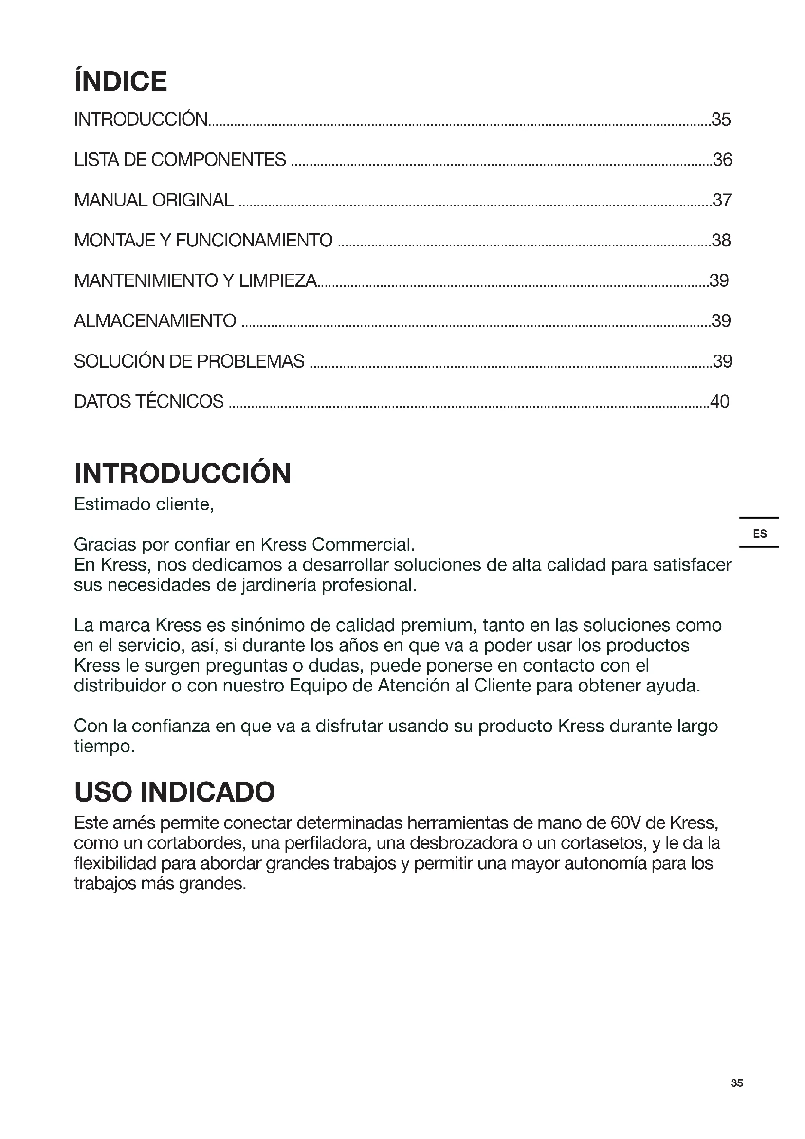 - DATOS TÉCNICOS INTRODUCCIÓN Estimado cliente, Gracias por conar en Kress Commercial. En Kress, nos dedicamos a desarrollar soluciones de alta calidad para satisfacer sus necesidades de jardinería profesional. La marca Kress es sinónimo de calidad premium, tanto en las soluciones como en el servicio, así, si durante los años en que va a poder usar los productos Kress le surgen preguntas o dudas, puede ponerse en contacto con el distribuidor o con nuestro Equipo de Atención al Cliente para obtener ayuda. Con la conanza en que va a disfrutar usando su producto Kress durante largo tiempo. USO INDICADO Este arnés permite conectar determinadas herramientas de mano de 60V de Kress, como un cortabordes, una perladora, una desbrozadora o un cortasetos, y le da la exibilidad para abordar grandes trabajos y permitir una mayor autonomía para los trabajos más grandes.36 p. 40