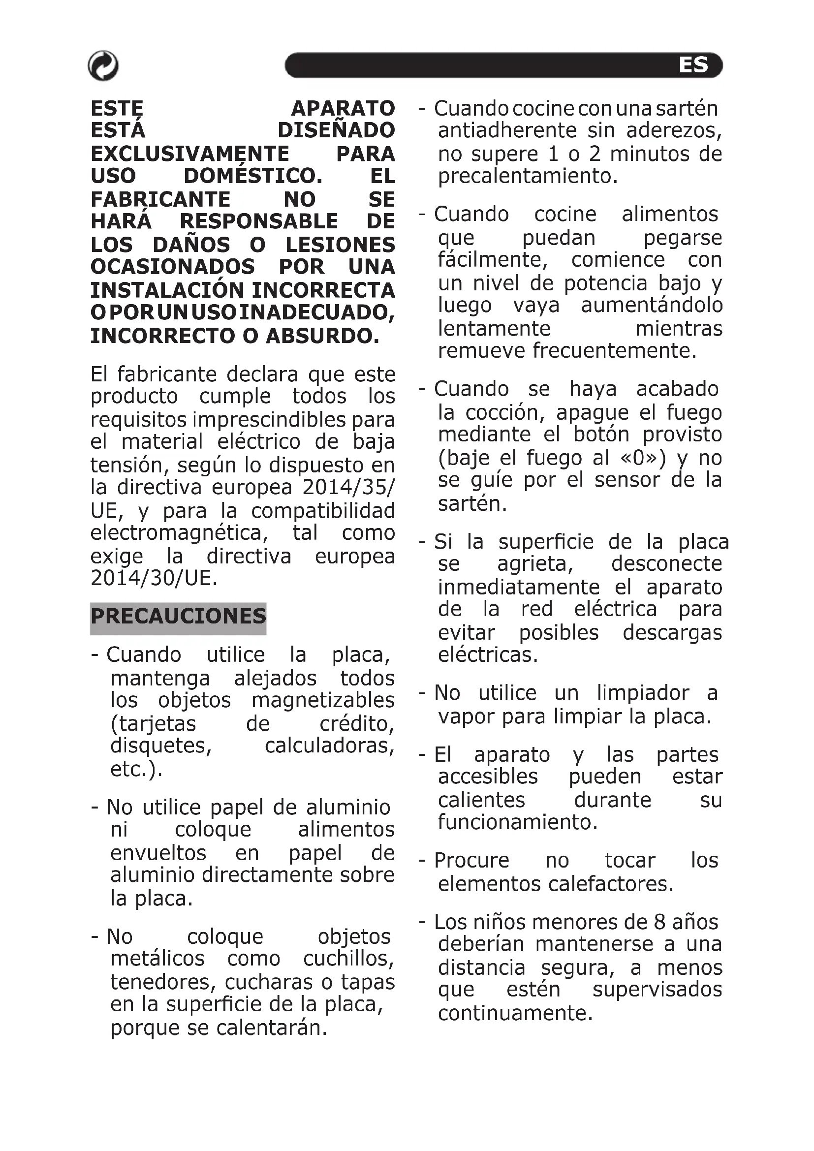 O POR UN USO INADECUADO, INCORRECTO O ABSURDO. El fabricante declara que este producto cumple todos los requisitos imprescindibles para el material eléctrico de baja tensión, según lo dispuesto en la directiva europea 2014/35/ UE, y para la compatibilidad electromagnética, tal como exige la directiva europea 2014/30/UE. PRECAUCIONES - Cuando utilice la placa, mantenga alejados todos los objetos magnetizables (tarjetas de crédito, disquetes, calculadoras, etc.). - No utilice papel de aluminio ni coloque alimentos envueltos en papel de aluminio directamente sobre la placa. - No coloque objetos metálicos como cuchillos, tenedores, cucharas o tapas en la supercie de la placa, porque se calentarán. - Cuando cocine con una sartén antiadherente sin aderezos, no supere 1 o 2 minutos de precalentamiento. - Cuando cocine alimentos que puedan pegarse fácilmente, comience con un nivel de potencia bajo y luego vaya aumentándolo lentamente mientras remueve frecuentemente. - Cuando se haya acabado la cocción, apague el fuego mediante el botón provisto (baje el fuego al «0») y no se guíe por el sensor de la sartén. - Si la supercie de la placa se agrieta, desconecte inmediatamente el aparato de la red eléctrica para evitar posibles descargas eléctricas. - No utilice un limpiador a vapor para limpiar la placa. - El aparato y las partes accesibles pueden estar calientes durante su funcionamiento. - Procure no tocar los elementos calefactores. - Los niños menores de 8 años deberían mantenerse a una distancia segura, a menos que estén supervisados continuamente.ES - Los niños mayores de 8 años y las personas cuyas capacidades físicas, sensoriales o mentales sean reducidas o tengan una falta de experiencia o de conocimientos pueden utilizar este aparato si están supervisados y han recibido instrucciones adecuadas sobre el uso seguro del aparato y entienden los peligros que implica. Los niños no deben jugar con el aparato. Los niños no deben encargarse de la limpieza ni del mantenimiento de usuario, salvo que estén en constante supervisión. - Cocinar con grasa o con aceite puede resultar peligroso y puede provocar un incendio si se deja sin atención. NUNCA intente extinguir un incendio con agua. En su lugar, desconecte el aparato y, a continuación, cubra las llamas con una tapa o con una bandeja, por ejemplo. - El proceso de cocción debe estar supervisado. Un proceso corto de cocción debe estar continuamente supervisado. - Cocinar en la placa con grasa o con aceite sin supervisión puede ser peligroso y podría provocar un incendio. - Riesgo de incendio: no acumule objetos sobre las supercies de cocción. - Solo se deberían utilizar como protección adecuada para la encimera incorporada en el aparato los protectores de encimera que se han diseñado para su uso con el aparato de cocción y que se encuentran enumerados en las instrucciones del fabricante. El uso de protectores inadecuados puede provocar accidentes. - No coloque ni deje caer objetos pesados sobre la placa. - No utilice batería de cocina con bordes irregulares. No arrastre la batería de cocina por la supercie de vidrio de inducción, ya que puede rayar el cristal. - Las personas que lleven marcapasos cardiacos u otros implantes eléctricos (como bombas de insulina) deben consultar a su médico o al fabricante del implante antes de usar este aparato para asegurarse de que sus implantes no se verán afectados por el campo electromagnético. - ADVERTENCIA: Las partes accesibles estarán calientes cuando se utiliceES el aparato. Se deberían mantener alejados a los niños para evitar quemaduras o escaldaduras. - Inserte en la instalación ja un medio de desconexión del suministro eléctrico con una separación de contacto en todos los polos que proporcione una desconexión total en condiciones de sobretensión de categoría III, de acuerdo con las normativas de cableado. Se debe llegar fácilmente al enchufe o al interruptor omnipolar del equipo instalado. - Este aparato no está diseñado para su uso a través de un temporizador externo o de un sistema de control remoto. - Los fabricantes rechazan cualquier responsabilidad en caso de incumplimiento con lo descrito anteriormente o si no se respetan ni se cumplen las normas de prevención de accidentes. Información sobre la cocina de inducción (F1)