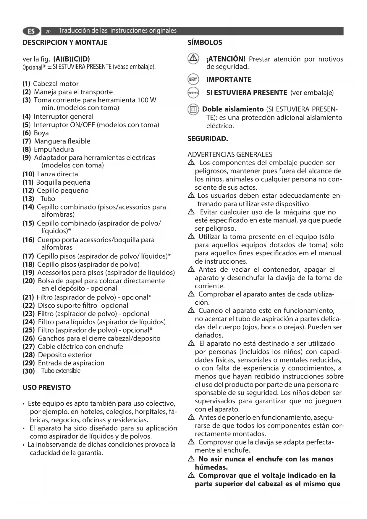 ver la g. (A)(B)(C)(D) Opcional* = SI ESTUVIERA PRESENTE (véase embalaje). (1) Cabezal motor (2) Maneja para el transporte (3) Toma corriente para herramienta 100 W min. (modelos con toma) (4) Interruptor general (5) Interruptor ON/OFF (modelos con toma) (6) Boya (7) Manguera exible (8) Empuñadura (9) Adaptador para herramientas eléctricas (modelos con toma) (10) Lanza directa (11) Boquilla pequeña (12) Cepillo pequeño (13) Tubo (14) Cepillo combinado (pisos/acessorios para alfombras) (15) Cepillo combinado (aspirador de polvo/ líquidos)* (16) Cuerpo porta acessorios/boquilla para alfombras (17) Cepillo pisos (aspirador de polvo/ líquidos)* (18) Cepillo pisos (aspirador de polvo) (19) Acessorios para pisos (aspirador de líquidos) (20) Bolsa de papel para colocar directamente en el depósito - opcional (21) Filtro (aspirador de polvo) - opcional* (22) Disco suporte ltro- opcional (23) Filtro (aspirador de polvo) - opcional (24) Filtro para líquidos (aspirador de líquidos) (25) Filtro (aspirador de polvo) - opcional* (26) Ganchos para el cierre cabezal/deposito (27) Cable eléctrico con enchufe (28) Deposito exterior (29) Entrada de aspiracion (30) Tubo extensible USO PREVISTO