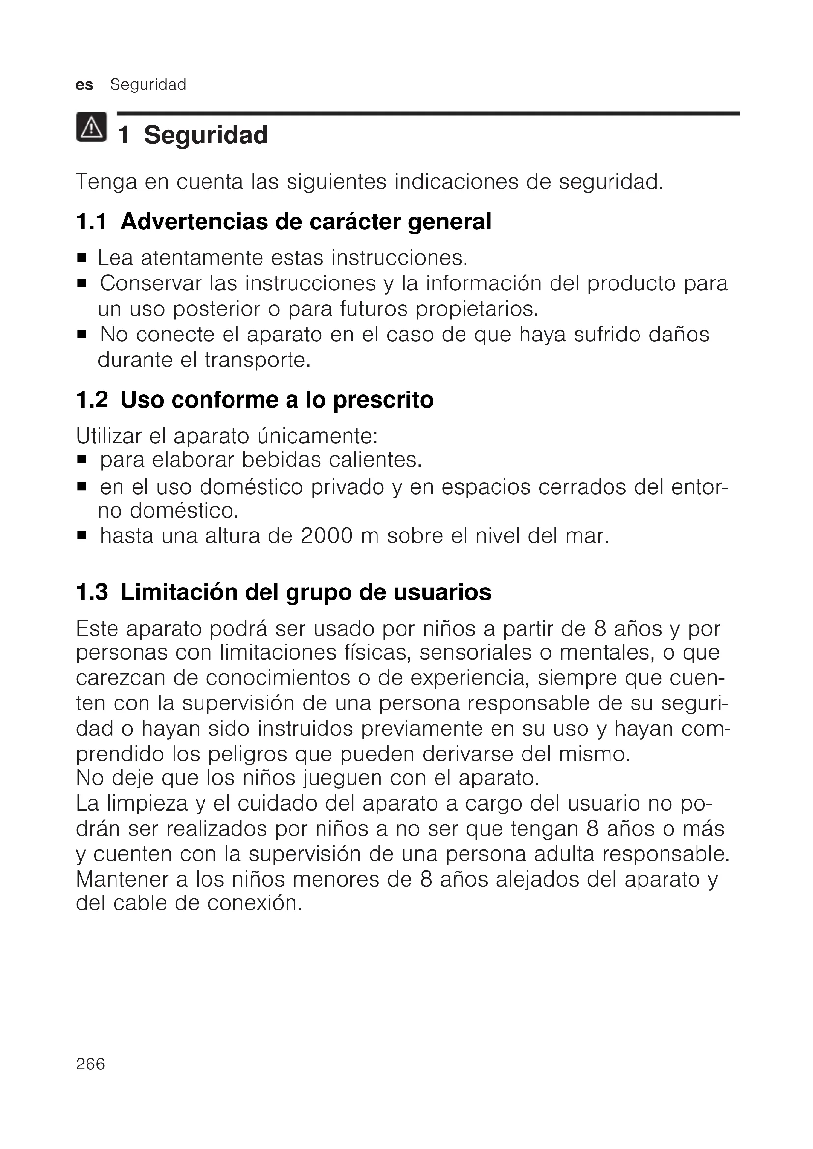 Lea atentamente estas instrucciones. ¡ Conservar las instrucciones y la información del producto para un uso posterior o para futuros propietarios. ¡ No conecte el aparato en el caso de que haya sufrido daños durante el transporte. 1.2 Uso conforme a lo prescrito Utilizar el aparato únicamente: ¡ para elaborar bebidas calientes. ¡ en el uso doméstico privado y en espacios cerrados del entor- no doméstico. ¡ hasta una altura de 2000msobre el nivel del mar. 1.3 Limitación del grupo de usuarios Este aparato podrá ser usado por niños a partir de 8 años y por personas con limitaciones físicas, sensoriales o mentales, o que carezcan de conocimientos o de experiencia, siempre que cuen- ten con la supervisión de una persona responsable de su seguri- dad o hayan sido instruidos previamente en su uso y hayan com- prendido los peligros que pueden derivarse del mismo. No deje que los niños jueguen con el aparato. La limpieza y el cuidado del aparato a cargo del usuario no po- drán ser realizados por niños a no ser que tengan 8 años o más y cuenten con la supervisión de una persona adulta responsable. Mantener a los niños menores de 8 años alejados del aparato y del cable de conexión.Seguridad es