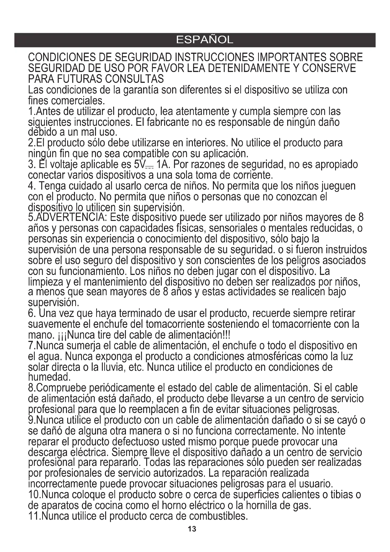 Las condiciones de la garantía son diferentes si el dispositivo se utiliza con fines comerciales. 1.Antes de utilizar el producto, lea atentamente y cumpla siempre con las siguientes instrucciones. El fabricante no es responsable de ningún daño debido a un mal uso. 2.El producto sólo debe utilizarse en interiores. No utilice el producto para ningún fin que no sea compatible con su aplicación.