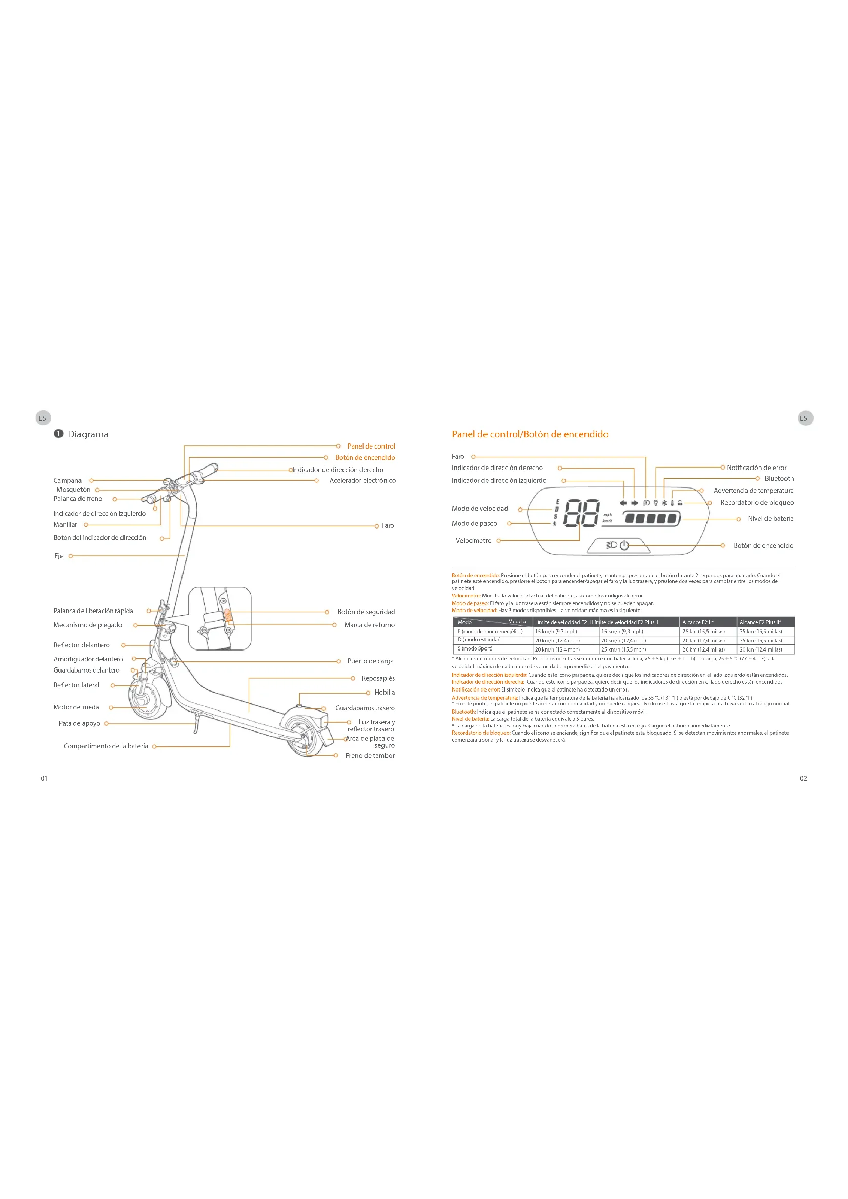 Panel de control/Botón de encendido Velocímetro Advertencia de temperatura Recordatorio de bloqueo Bluetooth Modo de velocidad Modo de paseo Faro Noticación de error Nivel de batería Botón de encendido Modelo Modo Límite de velocidad E2 II Límite de velocidad E2 Plus II 15 km/h (9,3 mph) 20 km/h (12,4 mph) 20 km/h (12,4 mph) 15 km/h (9,3 mph) 20 km/h (12,4 mph) 25 km/h (15,5 mph) Alcance E2 Plus II* 25 km (15,5 millas) 25 km (15,5 millas) 20 km (12,4 millas) Alcance E2 II* 25 km (15,5 millas) 20 km (12,4 millas) 20 km (12,4 millas) D (modo estándar) E (modo de ahorro energético) S (modo Sport) Campana Manillar Acelerador electrónico Botón del indicador de dirección Indicador de dirección izquierdo Indicador de dirección derecho Mosquetón Panel de control Palanca de freno Faro Eje Botón de seguridad Marca de retorno Mecanismo de plegado Palanca de liberación rápida Guardabarros delantero Amortiguador delantero Motor de rueda Puerto de carga Reposapiés Hebilla Guardabarros trasero Freno de tambor Reector lateral Reector delantero Pata de apoyo Compartimento de la batería Botón de encendido Indicador de dirección izquierdo Indicador de dirección derecho Luz trasera y reector trasero Area de placa de seguro