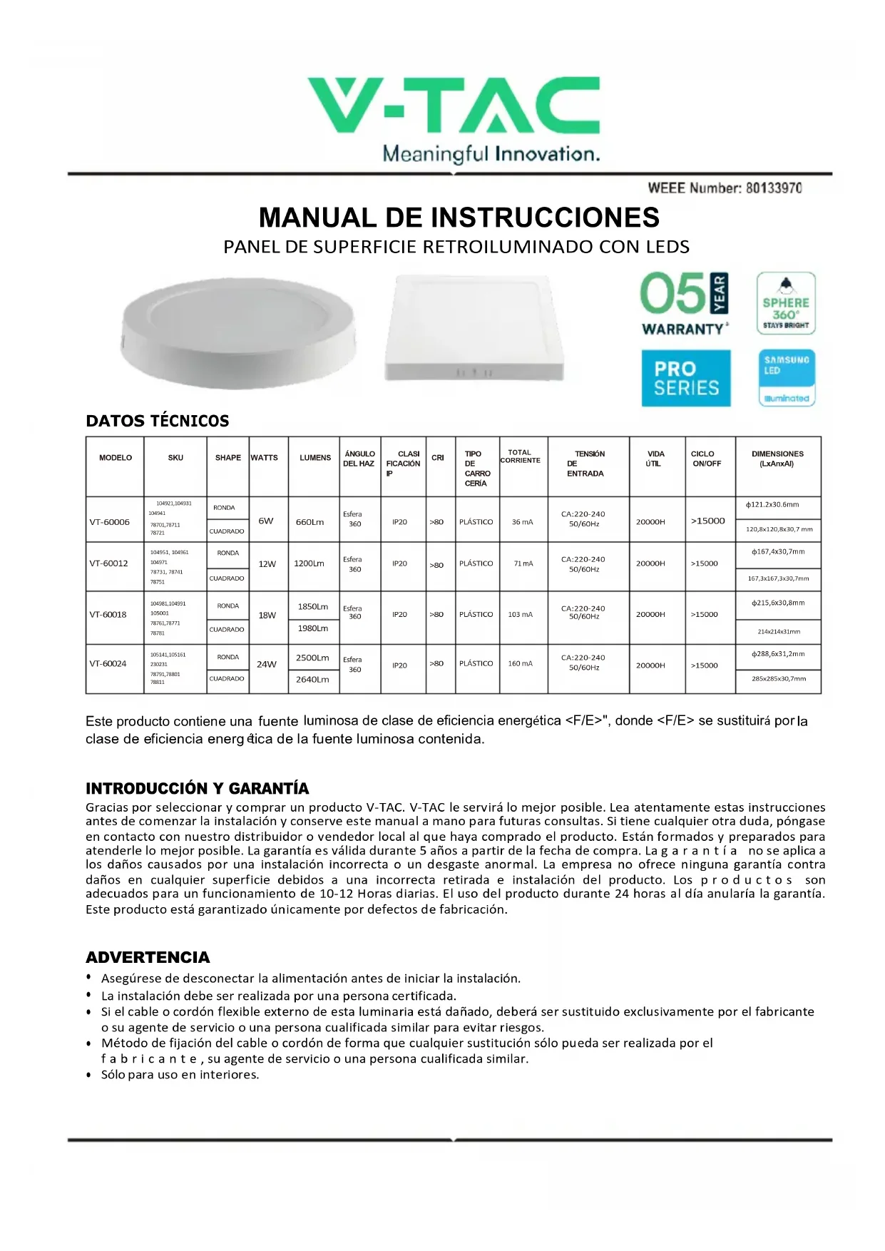 Gracias por seleccionar y comprar un producto V-TAC. V-TAC le servirá lo mejor posible. Lea atentamente estas instrucciones antes de comenzar la instalación y conserve este manual a mano para futuras consultas. Si tiene cualquier otra duda, póngase en contacto con nuestro distribuidor o vendedor local al que haya comprado el producto. Están formados y preparados para atenderle lo mejor posible. La garantía es válida durante 5 años a partir de la fecha de compra. La garantía no se aplica a los daños causados por una instalación incorrecta o un desgaste anormal. La empresa no ofrece ninguna garantía contra daños en cualquier superficie debidos a una incorrecta retirada e instalación del producto. Los productos son adecuados para un funcionamiento de 10-12 Horas diarias. El uso del producto durante 24 horas al día anularía la garantía. Este producto está garantizado únicamente por defectos de fabricación.