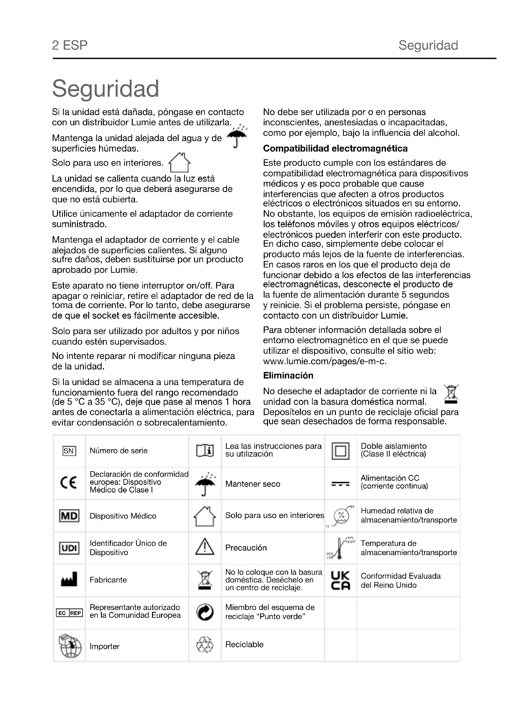 +70°C-25°C-13°F+158°F Conformidad Evaluada del Reino Unido Importer Seguridad Seguridad Si la unidad está dañada, póngase en contacto con un distribuidor Lumie antes de utilizarla. Mantenga la unidad alejada del agua y de superficies húmedas. Solo para uso en interiores. La unidad se calienta cuando la luz está encendida, por lo que deberá asegurarse de que no está cubierta. Utilice únicamente el adaptador de corriente suministrado. Mantenga el adaptador de corriente y el cable alejados de superficies calientes. Si alguno sufre daños, deben sustituirse por un producto aprobado por Lumie. Este aparato no tiene interruptor on/off. Para apagar o reiniciar, retire el adaptador de red de la toma de corriente. Por lo tanto, debe asegurarse de que el socket es fácilmente accesible. Solo para ser utilizado por adultos y por niños cuando estén supervisados. No intente reparar ni modificar ninguna pieza de la unidad. Si la unidad se almacena a una temperatura de funcionamiento fuera del rango recomendado (de 5 °C a 35 °C), deje que pase al menos 1 hora antes de conectarla a alimentación eléctrica, para evitar condensación o sobrecalentamiento. No debe ser utilizada por o en personas inconscientes, anestesiadas o incapacitadas, como por ejemplo, bajo la influencia del alcohol. Compatibilidad electromagnética Este producto cumple con los estándares de compatibilidad electromagnética para dispositivos médicos y es poco probable que cause interferencias que afecten a otros productos eléctricos o electrónicos situados en su entorno. No obstante, los equipos de emisión radioeléctrica, los teléfonos móviles y otros equipos eléctricos/ electrónicos pueden interferir con este producto. En dicho caso, simplemente debe colocar el producto más lejos de la fuente de interferencias. En casos raros en los que el producto deja de funcionar debido a los efectos de las interferencias electromagnéticas, desconecte el producto de la fuente de alimentación durante 5 segundos y reinicie. Si el problema persiste, póngase en contacto con un distribuidor Lumie. Para obtener información detallada sobre el entorno electromagnético en el que se puede utilizar el dispositivo, consulte el sitio web: www.lumie.com/pages/e-m-c. Eliminación No deseche el adaptador de corriente ni la unidad con la basura doméstica normal. Deposítelos en un punto de reciclaje oficial para que sean desechados de forma responsable.ESP 3 Introducción Lumie Bodyclock le despierta con un amanecer de forma natural. Se ha demostrado que despertarse con luz mejora el estado de ánimo, la energía, la productividad y la calidad del sueño y del despertar.