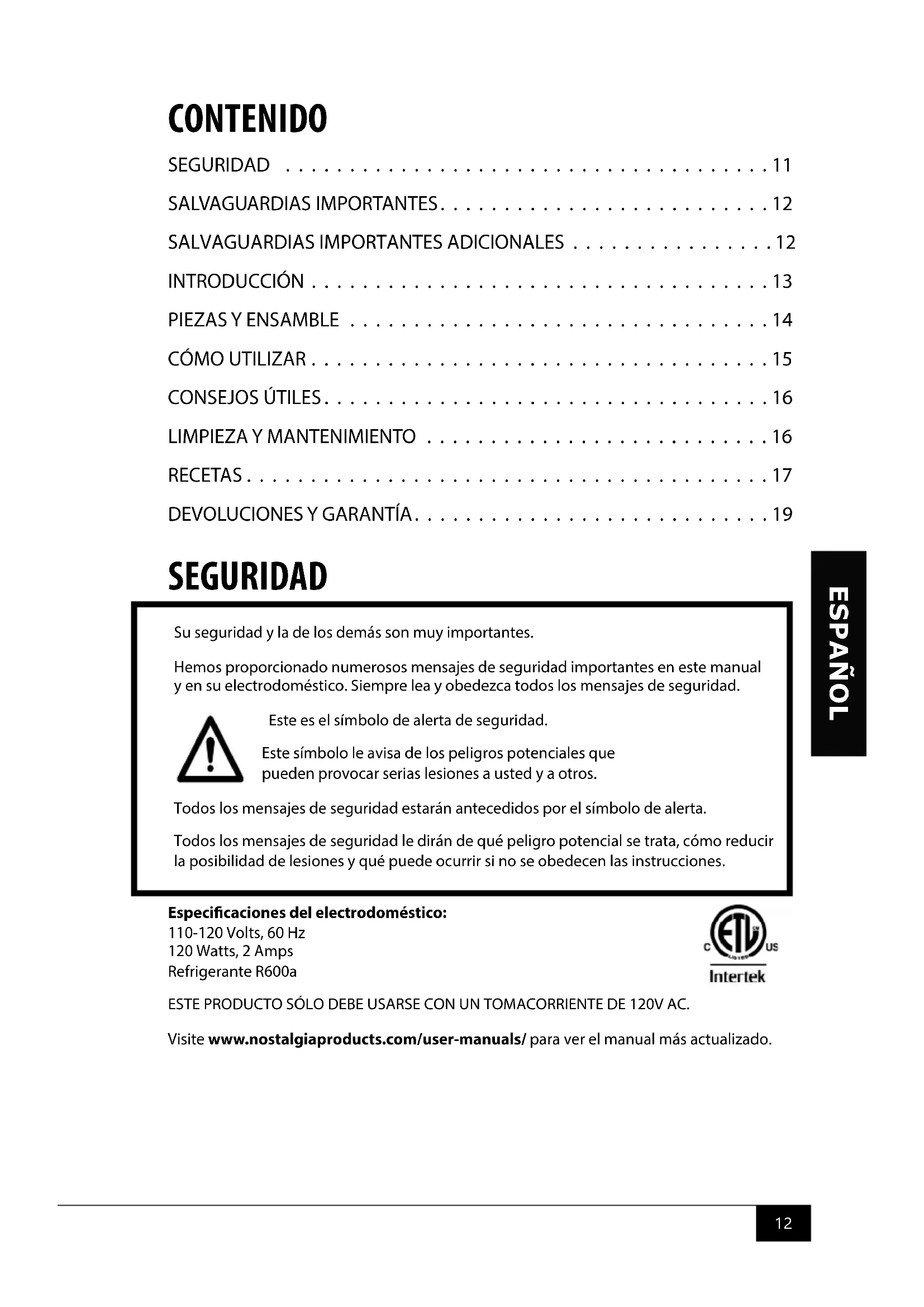 SEGURIDAD Especicaciones del electrodoméstico: 110-120 Volts, 60 Hz 120 Watts, 2 Amps Refrigerante R600a ESTE PRODUCTO SÓLO DEBE USARSE CON UN TOMACORRIENTE DE 120V AC. Visite www.nostalgiaproducts.com/user-manuals/ para ver el manual más actualizado. CONTENIDO SEGURIDAD . . . . . . . . . . . . . . . . . . . . . . . . . . . . . . . . . . . . . . 11 SALVAGUARDIAS IMPORTANTES . . . . . . . . . . . . . . . . . . . . . . . . . . 12