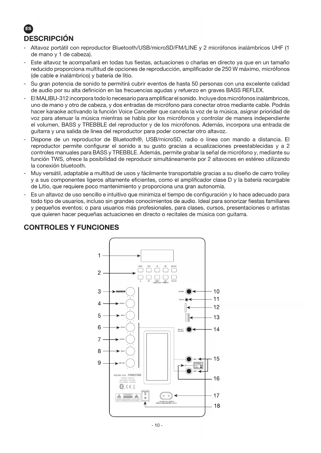 DESCRIPCIÓN - Altavoz portátil con reproductor Bluetooth/USB/microSD/FM/LINE y 2 micrófonos inalámbricos UHF (1 de mano y 1 de cabeza). - Este altavoz te acompañará en todas tus fiestas, actuaciones o charlas en directo ya que en un tamaño reducido proporciona multitud de opciones de reproducción, amplificador de 250 W máximo, micrófonos (de cable e inalámbrico) y batería de litio. - Su gran potencia de sonido te permitirá cubrir eventos de hasta 50 personas con una excelente calidad de audio por su alta definición en las frecuencias agudas y refuerzo en graves BASS REFLEX. - El MALIBU-312 incorpora todo lo necesario para amplificar el sonido. Incluye dos micrófonos inalámbricos, uno de mano y otro de cabeza, y dos entradas de micrófono para conectar otros mediante cable. Podrás hacer karaoke activando la función Voice Canceller que cancela la voz de la música, asignar prioridad de voz para atenuar la música mientras se habla por los micrófonos y controlar de manera independiente el volumen, BASS y TREBBLE del reproductor y de los micrófonos. Además, incorpora una entrada de guitarra y una salida de línea del reproductor para poder conectar otro altavoz. - Dispone de un reproductor de Bluetooth®, USB/microSD, radio o línea con mando a distancia. El reproductor permite configurar el sonido a su gusto gracias a ecualizaciones preestablecidas y a 2 controles manuales para BASS y TREBBLE. Además, permite grabar la señal de micrófono y, mediante su función TWS, ofrece la posibilidad de reproducir simultáneamente por 2 altavoces en estéreo utilizando la conexión bluetooth. - Muy versátil, adaptable a multitud de usos y fácilmente transportable gracias a su diseño de carro trolley y a sus componentes ligeros altamente eficientes, como el amplificador clase D y la batería recargable de Litio, que requiere poco mantenimiento y proporciona una gran autonomía. - Es un altavoz de uso sencillo e intuitivo que minimiza el tiempo de configuración y lo hace adecuado para todo tipo de usuarios, incluso sin grandes conocimientos de audio. Ideal para sonorizar fiestas familiares y pequeños eventos; o para usuarios más profesionales, para clases, cursos, presentaciones o artistas que quieren hacer pequeñas actuaciones en directo o recitales de música con guitarra.
