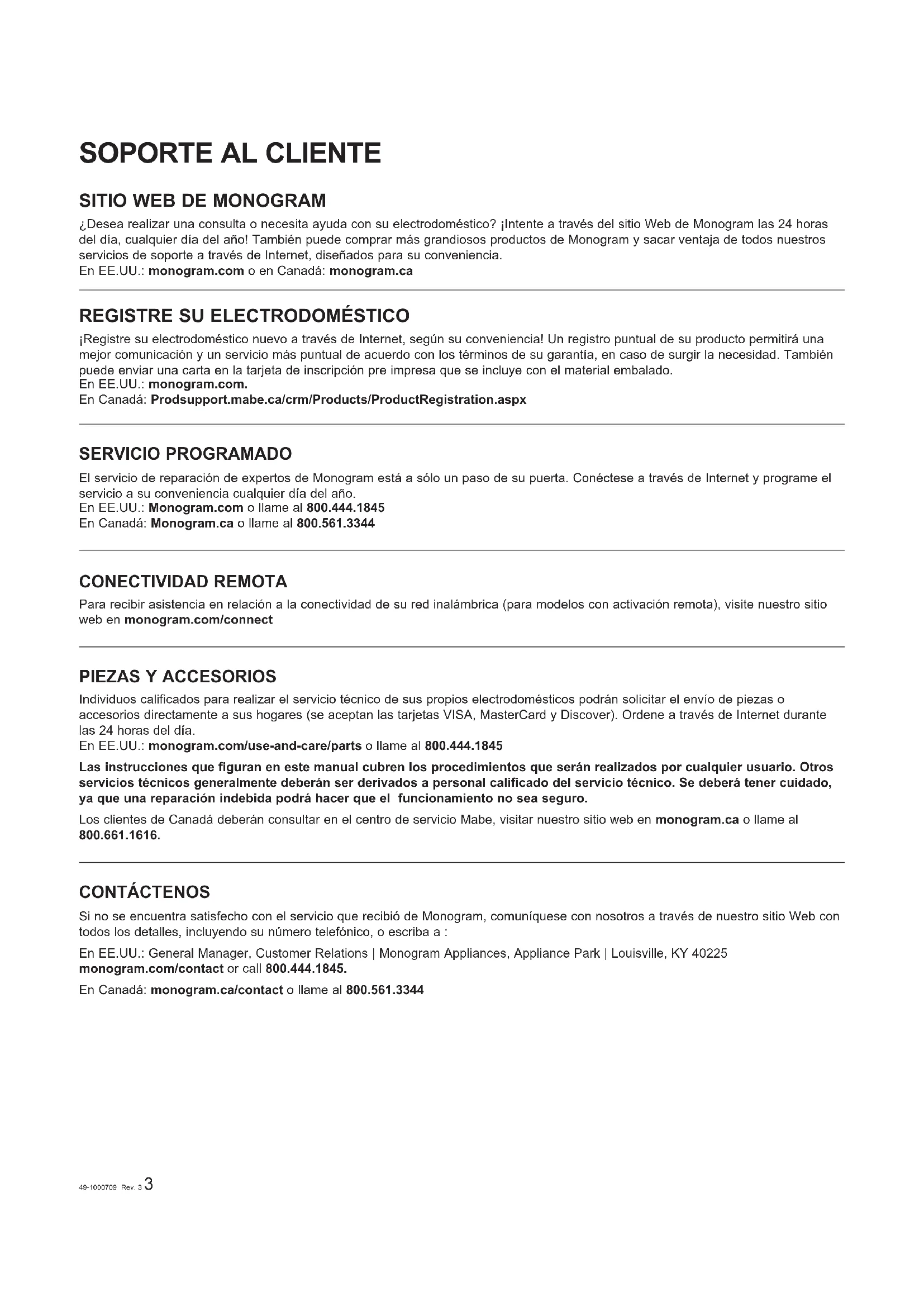 ¡Registre su electrodoméstico nuevo a través de Internet, según su conveniencia! Un registro puntual de su producto permitirá una mejor comunicación y un servicio más puntual de acuerdo con los términos de su garantía, en caso de surgir la necesidad. También puede enviar una carta en la tarjeta de inscripción pre impresa que se incluye con el material embalado. En EE.UU.: monogram.com. En Canadá: Prodsupport.mabe.ca/crm/Products/ProductRegistration.aspx SERVICIO PROGRAMADO El servicio de reparación de expertos de Monogram está a sólo un paso de su puerta. Conéctese a través de Internet y programe el servicio a su conveniencia cualquier día del año. En EE.UU.: Monogram.com o llame al 800.444.1845 En Canadá: Monogram.ca o llame al 800.561.3344 CONECTIVIDAD REMOTA Para recibir asistencia en relación a la conectividad de su red inalámbrica (para modelos con activación remota), visite nuestro sitio web en monogram.com/connect