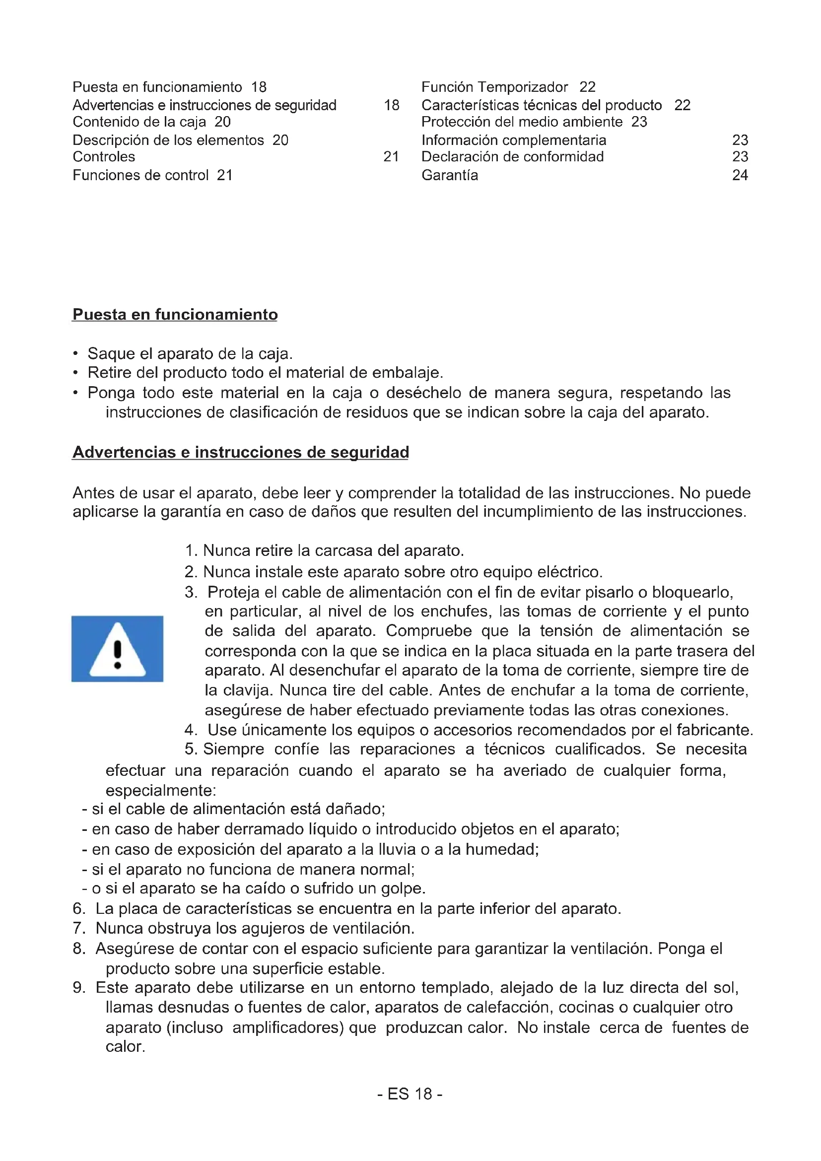 llamas desnudas o fuentes de calor, aparatos de calefacción, cocinas o cualquier otro aparato (incluso amplicadores) que produzcan calor. No inale cerca de fuentes de calor. Puesta en funcionamiento 18 Advertencias e instrucciones de seguridad 18 Contenido de la caja 20 Descripción de los elementos 20 Controles 21 Funciones de control 21 Función Temporizador 22 Características técnicas del producto 22 Protección del medio ambiente 23 Información complementaria 23 Declaración de conformidad 23 Garantía 24- ES 19 -