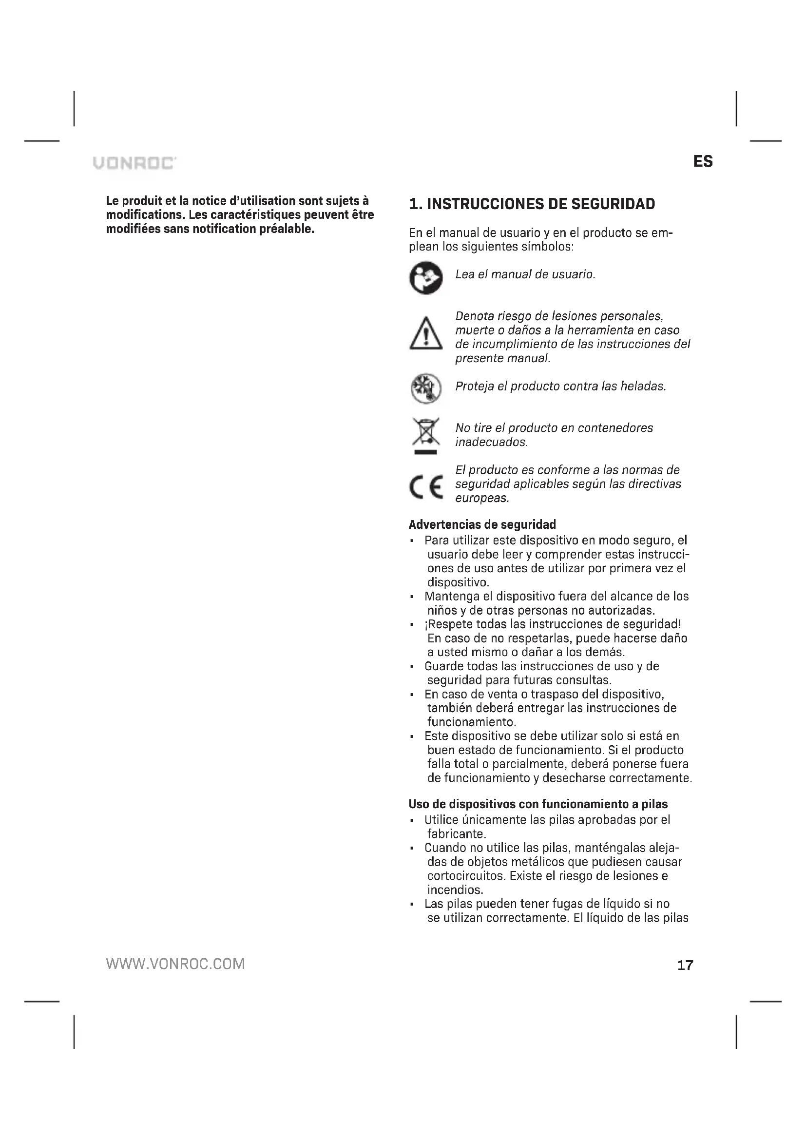 especificada en el presente documento, incluidas las garantías implícitas de comerciabilidad y de adecuación a un propósito particular. VONROC no será responsable bajo ninguna circunstancia de ningún daño incidental o consecuente. Los recursos de los distribuidores están limitados a la reparación o sustitución de las unidades o piezas no conformes.