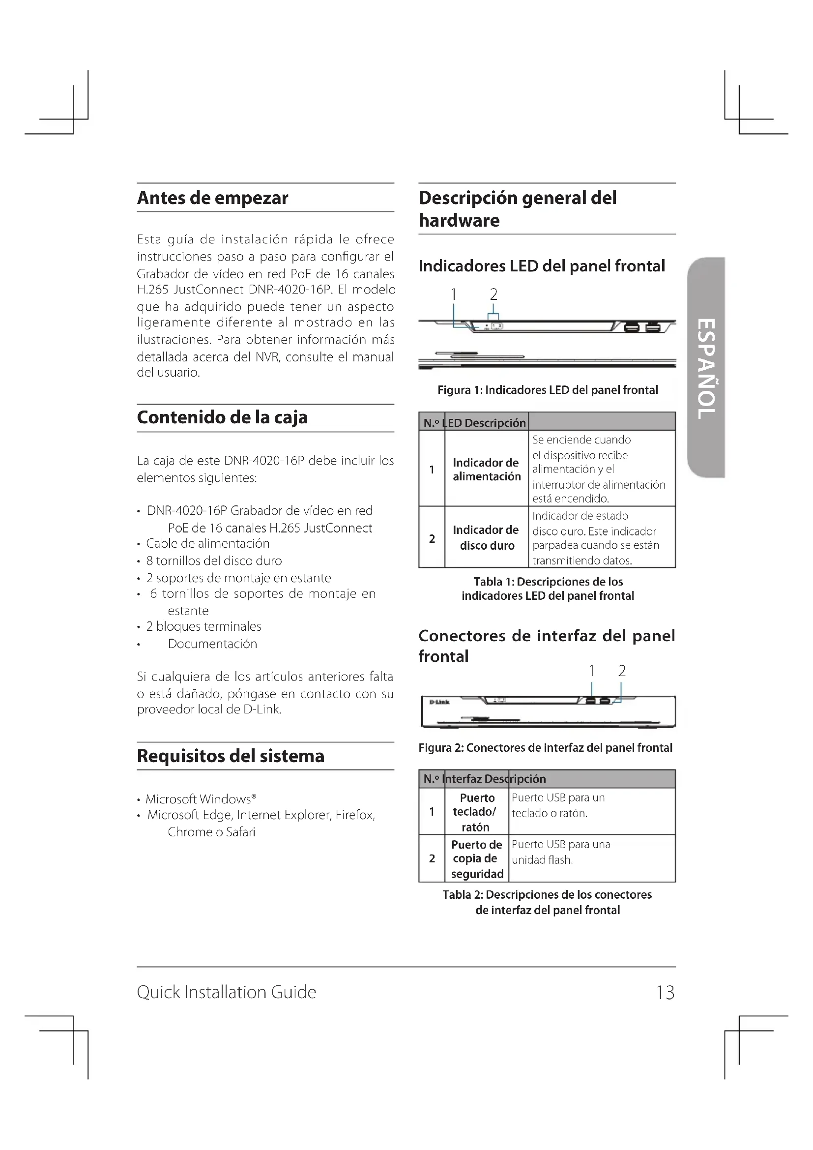 ESPAÑOL Descripción general del hardware Indicadores LED del panel frontal Figura 1: Indicadores LED del panel frontalN.º LED Descripción Indicador de alimentaciónSe enciende cuando el dispositivo recibe alimentación y el interruptor de alimentación está encendido. Indicador de disco duroIndicador de estado disco duro. Este indicador parpadea cuando se están transmitiendo datos.Tabla 1: Descripciones de los indicadores LED del panel frontal Conectores de interfaz del panel frontal Figura 2: Conectores de interfaz del panel frontalN.º Interfaz Descripción Puerto teclado/ratónPuerto USB para un teclado o ratón. Puerto de copia de seguridadPuerto USB para una unidad flash.Tabla 2: Descripciones de los conectores de interfaz del panel frontal Antes de empezar Esta guía de instalación rápida le ofrece instrucciones paso a paso para configurar el Grabador de vídeo en red PoE de 16 canales H.265 JustConnect DNR-4020-16P. El modelo que ha adquirido puede tener un aspecto ligeramente diferente al mostrado en las ilustraciones. Para obtener información más detallada acerca del NVR, consulte el manual del usuario. Contenido de la caja La caja de este DNR-4020-16P debe incluir los elementos siguientes: