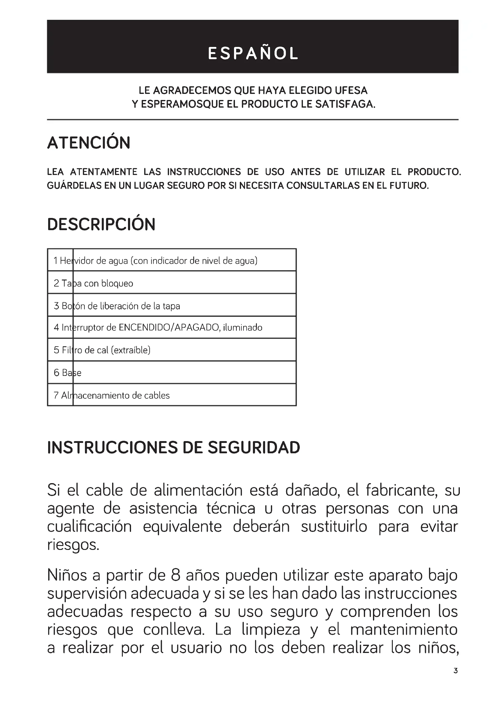 Este producto cumple con la Directiva Europea 2012/19/UE sobre dispositivos eléctricos y electrónicos, conocida como RAEE (Residuos de equipos eléctricos y electrónicos), que establece el marco legal aplicable en la Unión Europea para la eliminación y el reciclaje de dispositivos electrónicos y eléctricos. No deposite este producto en el cubo de basura. Llévelo al centro de recogida de residuos eléctricos y electrónicos más cercano a su domicilio.8 PORTUGUÊS OBRIGADO POR TER ESCOLHIDO O UFESA, ESPERAMOS QUE O PRODUTO CORRESPONDA ÀS SUAS EXPETATIVAS E SEJA DA SUA SATISFAÇÃO. AVISO LER AS INSTRUÇÕES DE UTILIZAÇÃO CUIDADOSAMENTE ANTES DE UTILIZAR O PRODUTO. GUARDAR ESTAS INSTRUÇÕES NUM LOCAL SEGURO PARA REFERÊNCIA FUTURA. DESCRIÇÃO 1 Chaleira (com indicador de nível de água) 2 Tampa com relógio 3 Botão para libertar a tampa 4 Interruptor ON/OFF, iluminado 5 Filtro de calcário (amovível) 6 Base 7 Armazenamento de cabos