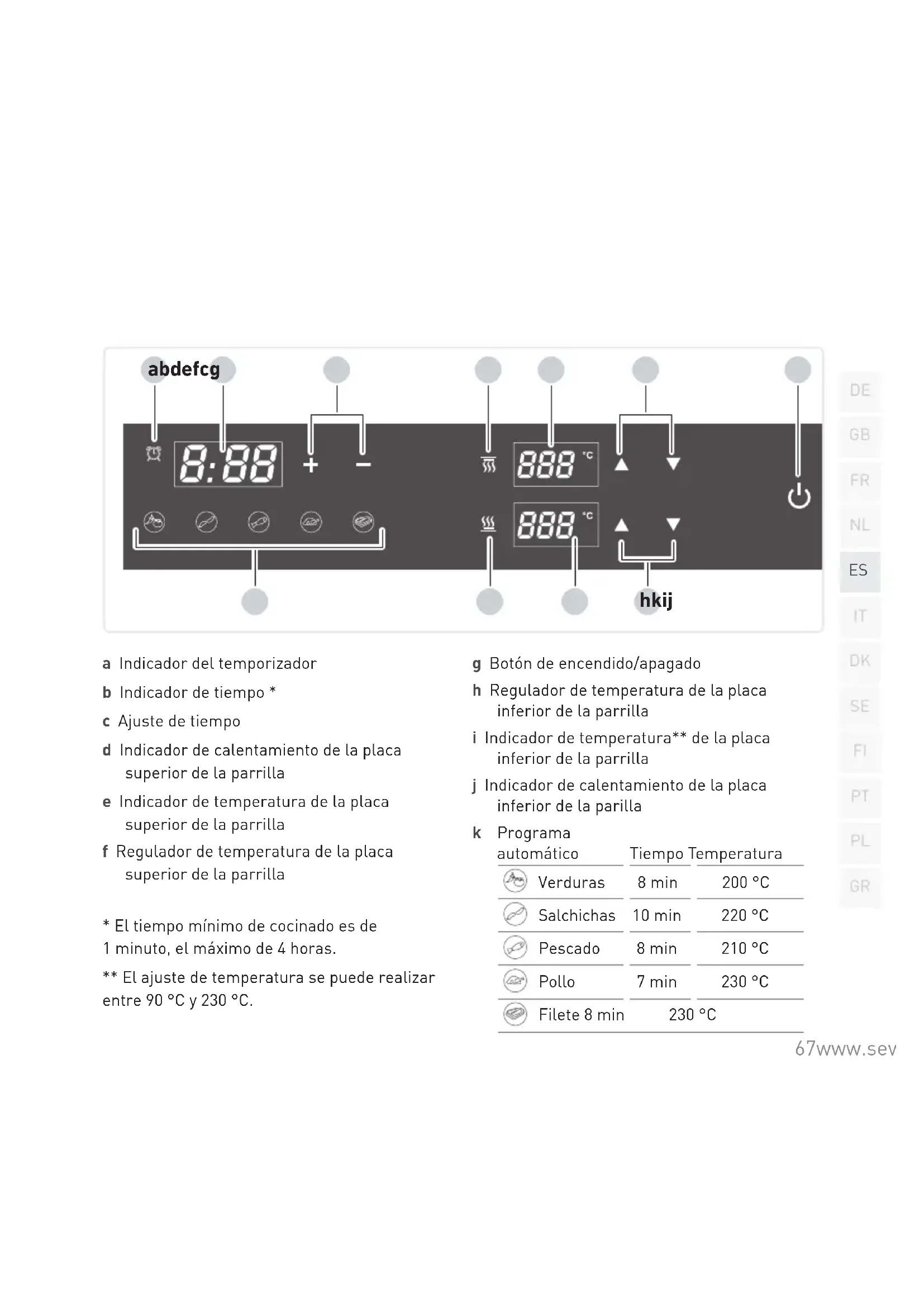 - El tiempo mínimo de cocinado es de 1minuto, el máximo de 4 horas. ** El ajuste de temperatura se puede realizar entre 90°C y 230°C. a b d e fc g hk ij g Botón de encendido/apagado h Regulador de temperatura de la placa inferior de la parrilla i Indicador de temperatura** de la placa inferior de la parrilla j Indicador de calentamiento de la placa inferior de la parilla