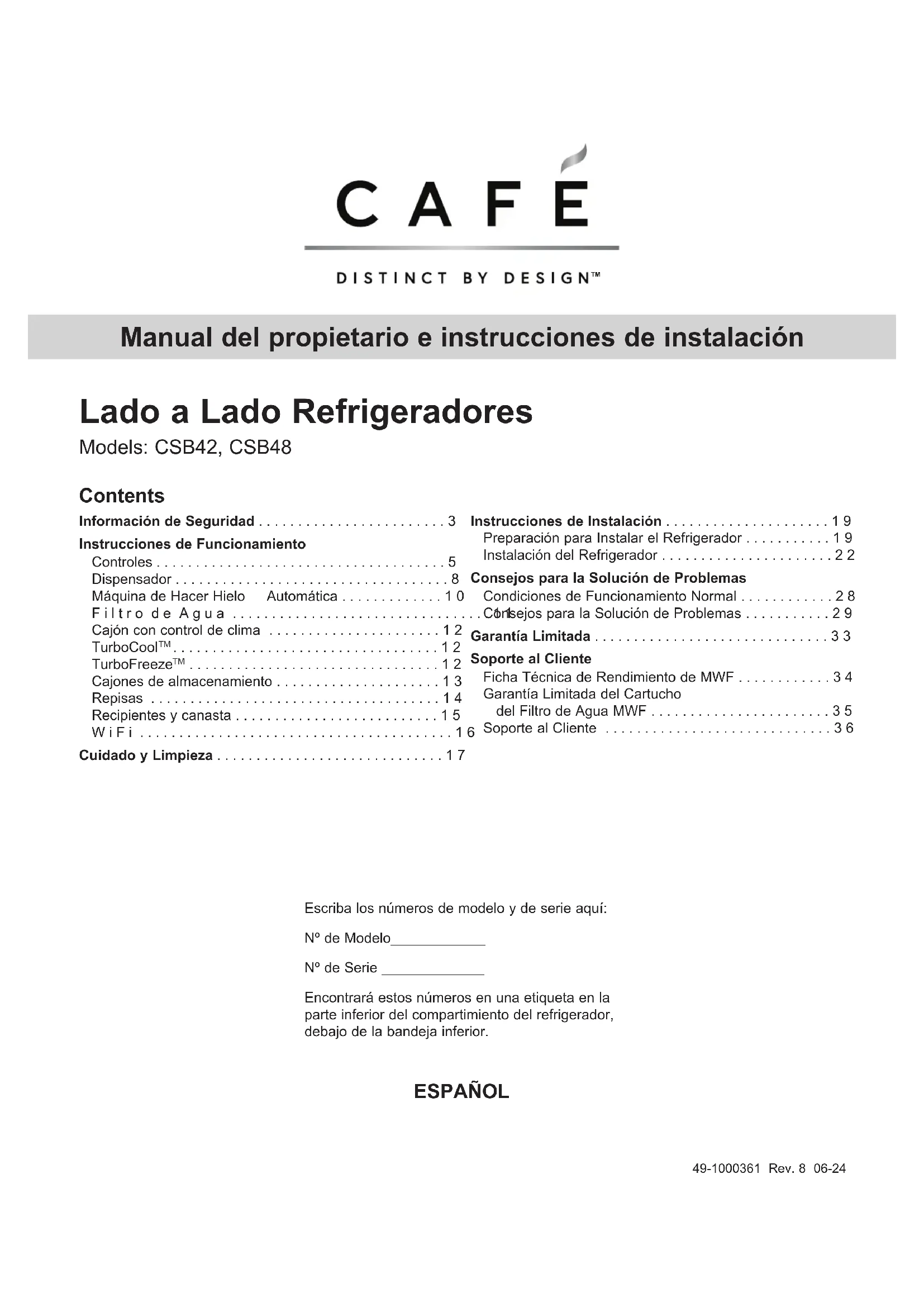 - Soporte al Cliente ESPAÑOL Manual del propietario e instrucciones de instalación TM2 49-1000361 Rev. 8 GRACIAS POR HACER QUE CAFÉ SEA PARTE DE SU HOGAR. Sentimos orgullo por el nivel de arte, innovación y diseño de cada uno de los electrodomésticos de Café, y creemos que usted también. Entre otras cosas, el registro de su electrodoméstico asegura que podamos entregarle información importante del producto y detalles de la garantía cuando los necesite. Registre su electrodoméstico Café ahora a través de Internet. Sitios Web y números telefónicos útiles están disponibles en la sección de Soporte para el Consumidor de este Manual del Propietario. También puede enviar una carta en la tarjeta de inscripción preimpresa que se incluye conel material embalado. TM49-1000361 Rev. 8 3 p. 36
