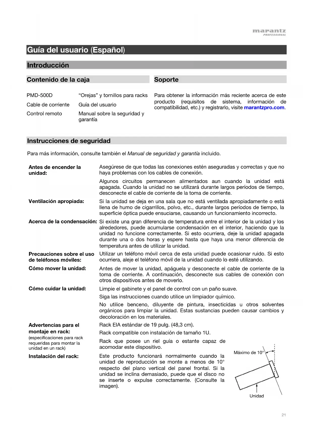 Soporte PMD-500D Cable de corriente Control remoto “Orejas” y tornillos para racks Guía del usuario Manual sobre la seguridad y garantía Para obtener la información más reciente acerca de este producto (requisitos de sistema, información de compatibilidad, etc.) y registrarlo, visite marantzpro.com. Instrucciones de seguridad Para más información, consulte también el Manual de seguridad y garantía incluido.