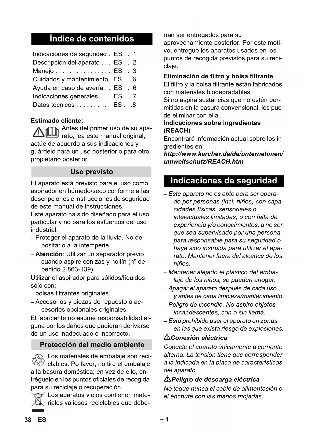 - J 1 36 NL– 6 afdekking ontgrendelen en wegnemen. Na de reiniging opnieuw aanbrengen en vergrendelen (markering en symbo- len in acht nemen). Voor de montage eerst de vlotter in- brengen, dan de vlottermand plaatsen en vergrendelen. Indien de zuigkracht van het apparaat af- neemt, moeten de volgende punten gecon- troleerd worden: Accessoires, zuigslang of zuigbuizen zijn verstopt, verstopping verwijderen. Vlakvouwfilter is verontreinigd: Bij apparaten zonder ExPress filter- reiniging: Vlakvouwfilter demonteren en reinigen (zie hoofdstuk „Vlakvouwfil- ter reinigen“). Bij apparaten met ExPress filterreini- ging: Filterreinigingsknop 3 x indruk- ken, indien nodig de reiniging herhalen met een gesloten zuigslang (zie hoofd- stuk „Vlakvouwfilter reinigen“). Indien nodig filter onder stromend water reinigen. Beschadigde vlakvouwfilter vervangen. Filterzak is vol: Nieuwe filterzak plaat- sen (bestel-nr. zie onderdelenlijst ach- teraan in de gebruiksaanwijzing). 몇 Let op Filterzakopname niet wegwerpen! In elk land gelden de door onze hiervoor ver- antwoordelijke verkoopmaatschappij uitgege- ven garantievoorwaarden. Eventuele storingen aan het apparaat verhelpen wij zon- der kosten binnen de garantietermijn als een materiaal of fabrieksfout hiervan de oorzaak is. Neem bij klachten binnen de garantietermijn contact op met uw leverancier of de dichtstbij- zijnde klantenservicewerkplaats en neem de accessoires en uw aankoopbewijs mee. (adres zie achterzijde) Bij vragen of storingen helpt onze KÄR- CHER-filiaal u graag verder. (adres zie achterzijde) Een selectie van de meest frequent beno- digde reserveonderdelen vindt u achteraan in de gebruiksaanwijzing. Reserveonderdelen en toebehoren zijn verkrijgbaar bij uw handelaar of uw KÄR- CHER-filiaal. (adres zie achterzijde) De technische gegevens zijn te vinden op de uitklapbare pagina's. Hierna de verkla- ring van de daar gebruikte symbolen. Technische veranderingen voorbehou- den! Te weinig zuigcapaciteit Algemene instructies Garantie Klantenservice Bestelling van reserveonderdelen en bijzondere toebehoren Technische gegevens Spanning Vermogen Pnom. Vermogen Pmax. Max. aansluitvermogen van de contactdoos van het apparaat. Netzekering (traag) Reservoirvolume Wateropneming met handgreep Wateropneming met vloerkop Netkabel Geluidsniveau (EN 60704-2-1) Gewicht (excl. accessoires) 37NL– 1 Estimado cliente: Antes del primer uso de su apa- rato, lea este manual original, actúe de acuerdo a sus indicaciones y guárdelo para un uso posterior o para otro propietario posterior. El aparato está previsto para el uso como aspirador en húmedo/seco conforme a las descripciones e instrucciones de seguridad de este manual de instrucciones. Este aparato ha sido diseñado para el uso particular y no para los esfuerzos del uso industrial. – Proteger el aparato de la lluvia. No de- positarlo a la intemperie. – Atención: Utilizar un separador previo cuando aspire cenizas y hollín (nº de pedido 2.863-139). Utilizar el aspirador para sólidos/líquidos sólo con: – bolsas filtrantes originales. – Accesorios y piezas de repuesto o ac- cesorios opcionales originales. El fabricante no asume responsabilidad al- guna por los daños que pudieran derivarse de un uso inadecuado o incorrecto. Los materiales de embalaje son reci- clables. Po favor, no tire el embalaje a la basura doméstica; en vez de ello, en- tréguelo en los puntos oficiales de recogida para su reciclaje o recuperación. Los aparatos viejos contienen mate- riales valiosos reciclables que debe- rían ser entregados para su aprovechamiento posterior. Por este moti- vo, entregue los aparatos usados en los puntos de recogida previstos para su reci- claje. El filtro y la bolsa filtrante están fabricados con materiales biodegradables. Si no aspira sustancias que no estén per- mitidas en la basura convencional, los pue- de eliminar con ella. Indicaciones sobre ingredientes (REACH) Encontrará información actual sobre los in- gredientes en: http://www.karcher.de/de/unternehmen/ umweltschutz/REACH.htm – Este aparato no es apto para ser opera- do por personas (incl. niños) con capa- cidades físicas, sensoriales o intelectuales limitadas, o con falta de experiencia y/o conocimientos, a no ser que sea supervisado por una persona para responsable para su seguridad o haya sido instruida para utilizar el apa- rato. Mantener fuera del alcance de los niños. – Mantener alejado el plástico del emba- laje de los niños, se pueden ahogar. – Apagar el aparato después de cada uso y antes de cada limpieza/mantenimiento. – Peligro de incendio. No aspire objetos incandescentes, con o sin llama. – Está prohibido usar el aparato en zonas en las que exista riesgo de explosiones. 몇 Conexión eléctrica Conecte el aparato únicamente a corriente alterna. La tensión tiene que corresponder a la indicada en la placa de características del aparato. Peligro de descarga eléctrica No toque nunca el cable de alimentación o el enchufe con las manos mojadas. Índice de contenidos Indicaciones de seguridad . ES Descripción del aparato p. 1