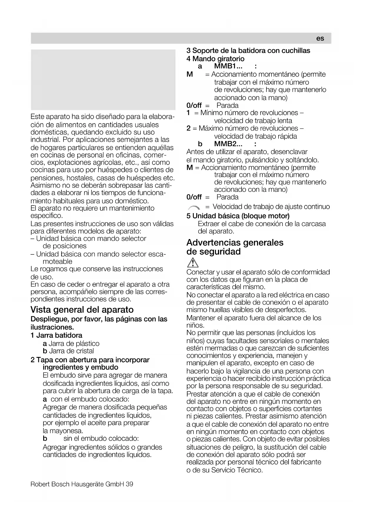 Oikeudet muutoksiin pidätetään.Robert Bosch Hausgeräte GmbH 39 Este aparato ha sido diseñado para la elabora- ción de alimentos en cantidades usuales domésticas, quedando excluido su uso industrial. Por aplicaciones semejantes a las de hogares particulares se entienden aquéllas en cocinas de personal en oficinas, comer- cios, explotaciones agrícolas, etc., así como cocinas para uso por huéspedes o clientes de pensiones, hostales, casas de huéspedes etc. Asimismo no se deberán sobrepasar las canti- dades a elaborar ni los tiempos de funciona- miento habituales para uso doméstico. El aparato no requiere un mantenimiento especifico. Las presentes instrucciones de uso son válidas para diferentes modelos de aparato: – Unidad básica con mando selector de posiciones – Unidad básica con mando selector esca- moteable Le rogamos que conserve las instrucciones de uso. En caso de ceder o entregar el aparato a otra persona, acompáñelo siempre de las corres- pondientes instrucciones de uso. Vista general del aparato Despliegue, por favor, las páginas con las ilustraciones. 1 Jarra batidora a Jarra de plástico b Jarra de cristal 2 Tapa con abertura para incorporar ingredientes y embudo El embudo sirve para agregar de manera dosificada ingredientes líquidos, así como para cubrir la abertura de carga de la tapa. a con el embudo colocado: Agregar de manera dosificada pequeñas cantidades de ingredientes líquidos, por ejemplo el aceite para preparar la mayonesa. b sin el embudo colocado: Agregar ingredientes sólidos o grandes cantidades de ingredientes líquidos. 3 Soporte de la batidora con cuchillas 4 Mando giratorio a MMB1... : M = Accionamiento momentáneo (permite trabajar con el máximo número de revoluciones; hay que mantenerlo accionado con la mano) 0/off = Parada 1 = Mínimo número de revoluciones – velocidad de trabajo lenta 2 = Máximo número de revoluciones – velocidad de trabajo rápida b MMB2... : Antes de utilizar el aparato, desenclavar el mando giratorio, pulsándolo y soltándolo. M = Accionamiento momentáneo (permite trabajar con el máximo número de revoluciones; hay que mantenerlo accionado con la mano) 0/off = Parada = Velocidad de trabajo de ajuste continuo 5 Unidad básica (bloque motor) Extraer el cabe de conexión de la carcasa del aparato. Advertencias generales de seguridad flmÉäáÖêç=ÇÉ=ÇÉëÅ~êÖ~=Éä¨ÅíêáÅ~> Conectar y usar el aparato sólo de conformidad con los datos que figuran en la placa de características del mismo. No conectar el aparato a la red eléctrica en caso de presentar el cable de conexión o el aparato mismo huellas visibles de desperfectos. Mantener el aparato fuera del alcance de los niños. No permitir que las personas (incluidos los niños) cuyas facultades sensoriales o mentales estén mermadas o que carezcan de suficientes conocimientos y experiencia, manejen y manipulen el aparato, excepto en caso de hacerlo bajo la vigilancia de una persona con experiencia o hacer recibido instrucción práctica por la persona responsable de su seguridad. Prestar atención a que el cable de conexión del aparato no entre en ningún momento en contacto con objetos o superficies cortantes ni piezas calientes. Prestar asimismo atención a que el cable de conexión del aparato no entre en ningún momento en contacto con objetos o piezas calientes. Con objeto de evitar posibles situaciones de peligro, la sustitución del cable de conexión del aparato sólo podrá ser realizada por personal técnico del fabricante o de su Servicio Técnico.